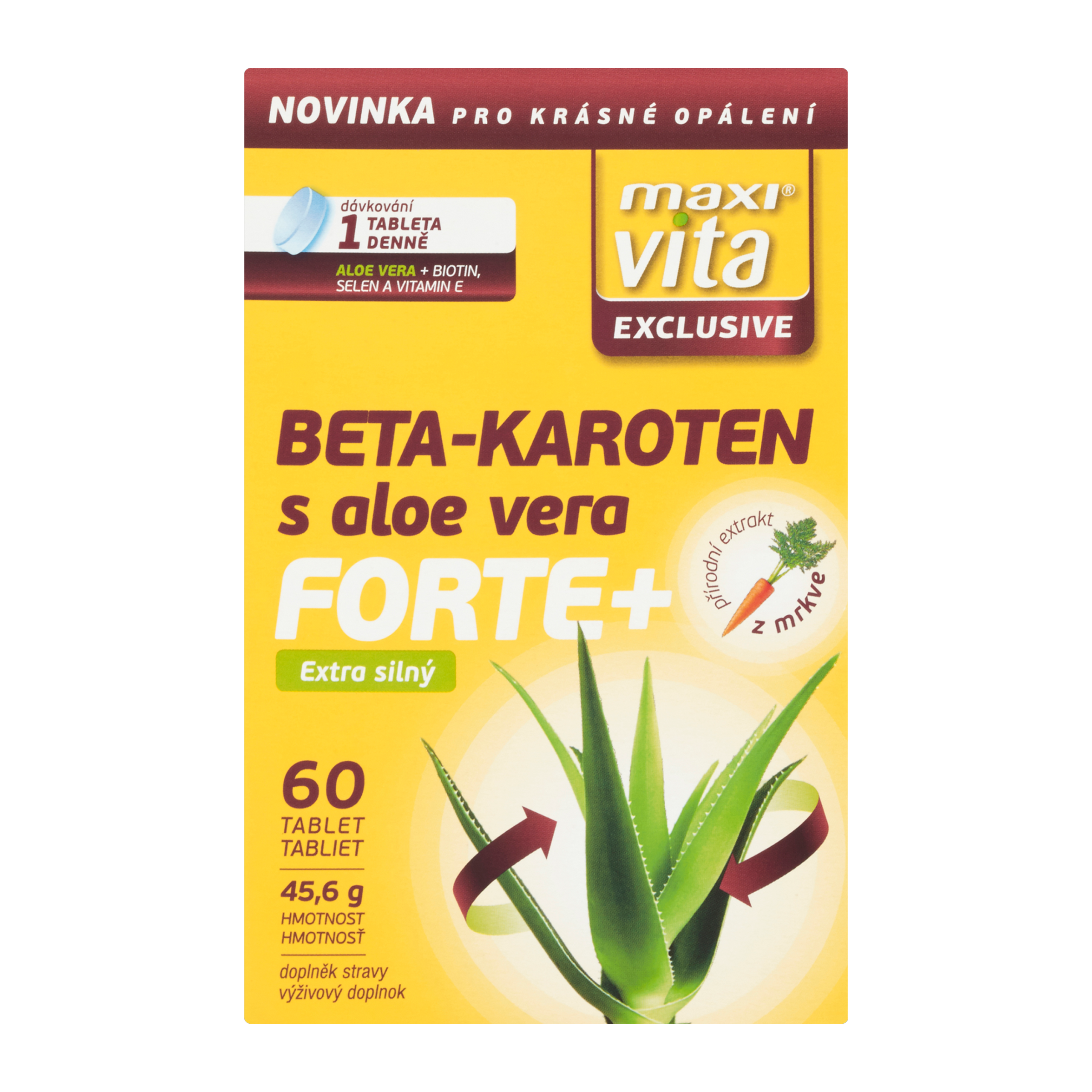 MaxiVita Exclusive Beta-karoten s aloe vera Forte+ obsahuje extrakt z mrkve, který je významným zdrojem přírodního beta-karotenu. Extrakt je obohacen o další důležité látky, vitamin E a selen. Beta-karoten je provitaminem vitaminu A, důležitého antioxidantu, který udržuje normální stav pokožky, pečuje o ni a pomáhá jí získat a udržet krásnou barvu po pobytu na slunci. Současně je nezbytný pro normální funkci zraku a imunitního systému. Významnou roli sehrávají také vitamin E a selen. Přispívají k ochraně buněk před oxidativním stresem. Ten vzniká tehdy, když v těle nastane nerovnováha mezi produkcí volných radikálů a jejich zneškodňováním pomocí antioxidantů. Vitamin E a selen pomáhají odstraňovat volné radikály, ochraňují buňky před jejich poškozením a tím i stárnutím. Aloe Vera přispívá k normálnímu stavu pokožky a detoxikaci organizmu.