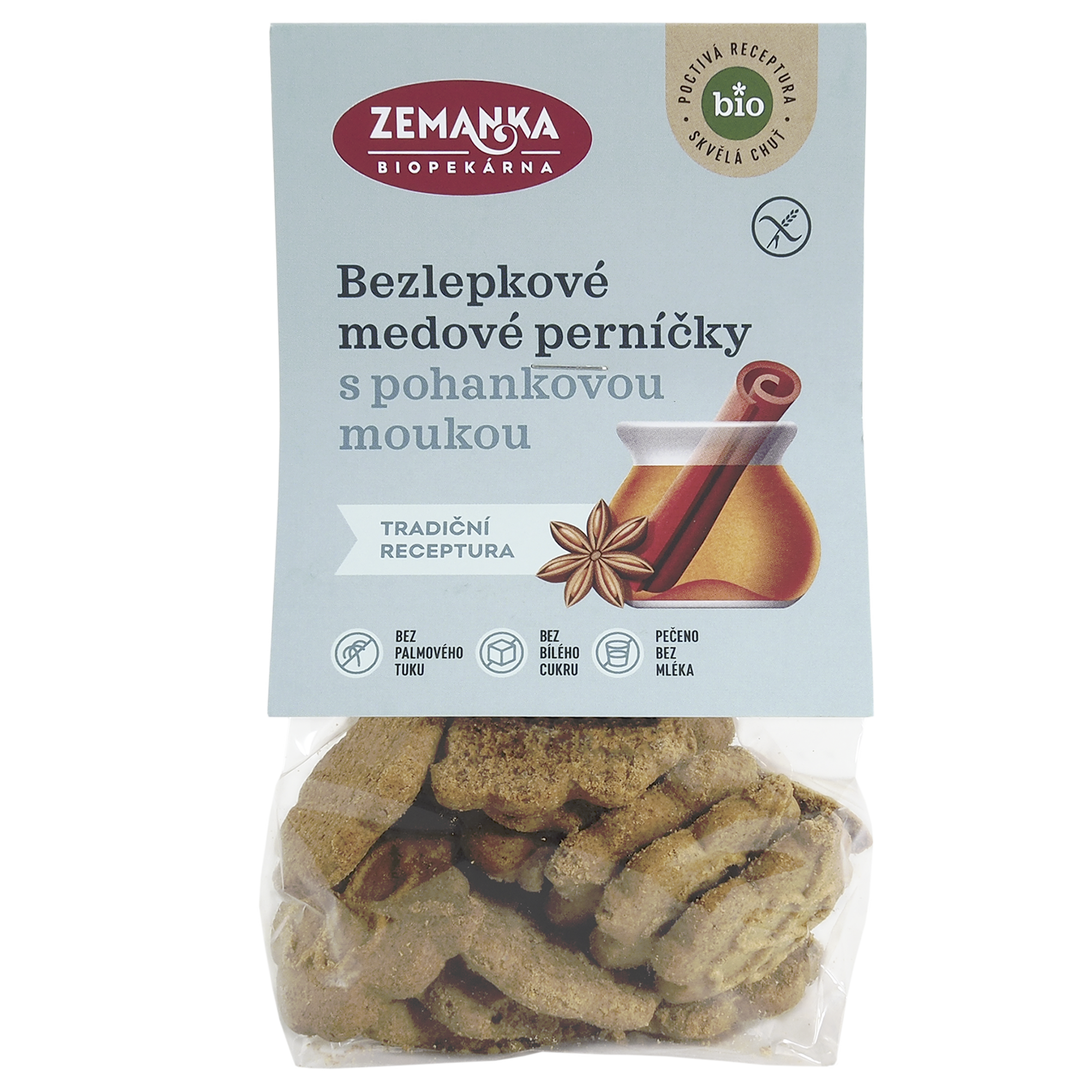 Bio pohanková mouka 24 %, bio kukuřičná mouka, bio rostlinný tuk (bio slunečnicový olej s vysokým obsahem kyseliny olejové, bio rostlinný tuk Shea, voda), bio třtinový cukr, bio med 12 %, bio vejce, bio skořice mletá 0,5 %, bio perníkové koření (bio skořice, bio anýz, bio hřebíček, bio koriandr, bio kardamon v různém poměru) 0,5 %, kypřící látka - hydrogenuhličitan sodný. Použitá kypřící látka neobsahuje fosfáty. Může obsahovat stopy mléčných výrobků (včetně laktózy) a skořápkových plodů (lískové a vlašské ořechy).