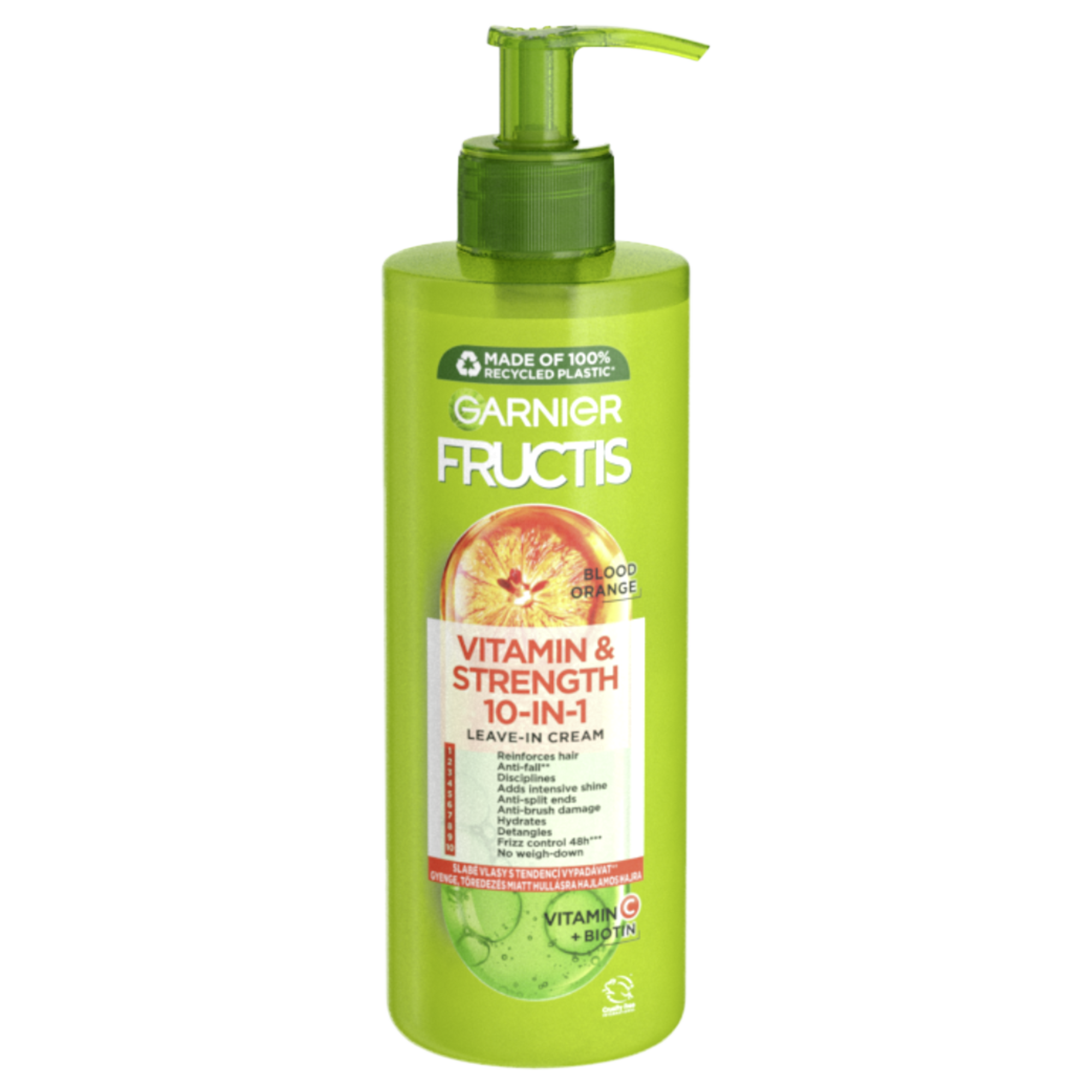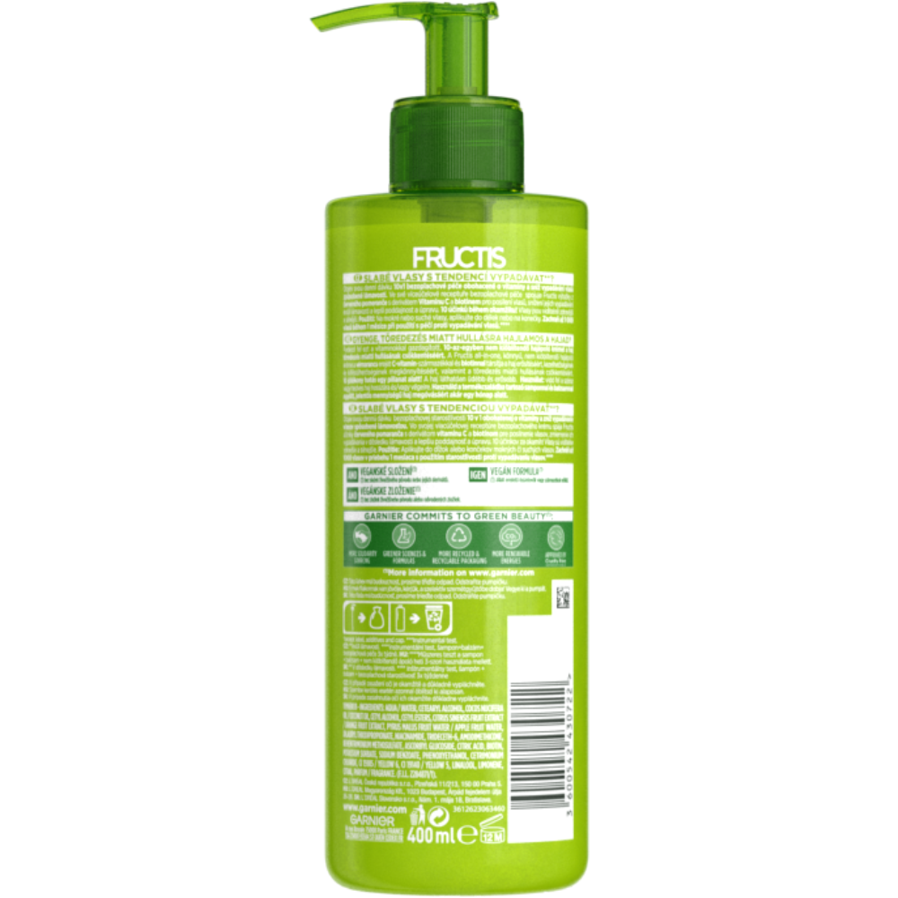 Ve své víceúčelové receptuře bezoplachové péče spojuje Fructis výtažky z červeného pomeranče s derivátem vitaminu C a biotinem pro posílení vlasů, snížení jejich vypadávání kvůli lámavosti a lepší poddajnost a úpravu. Posilující 10v1 bezoplachová péče pro slabé vlasy s tendencí vypadávat kvůli lámavosti.