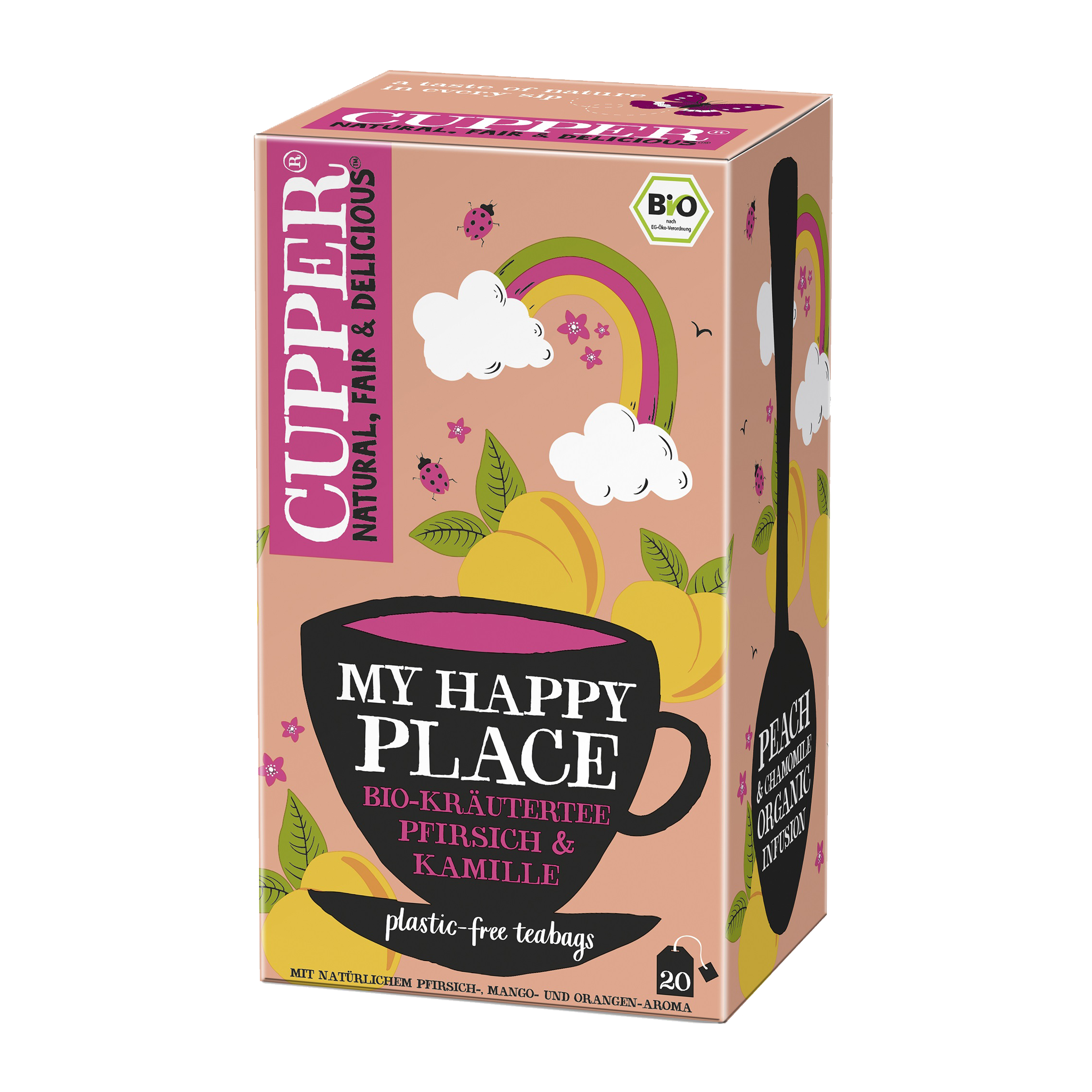 Náš čaj My Happy Place je ztělesněním relaxace, štěstí a požitku. Harmonická směs kombinuje lahodnou sladkost broskví s uklidňujícími účinky heřmánku a vytváří nápoj, který promění každý okamžik v požitek. My Happy Place vás příjemně prohřeje jako teplé paprsky letního slunce.