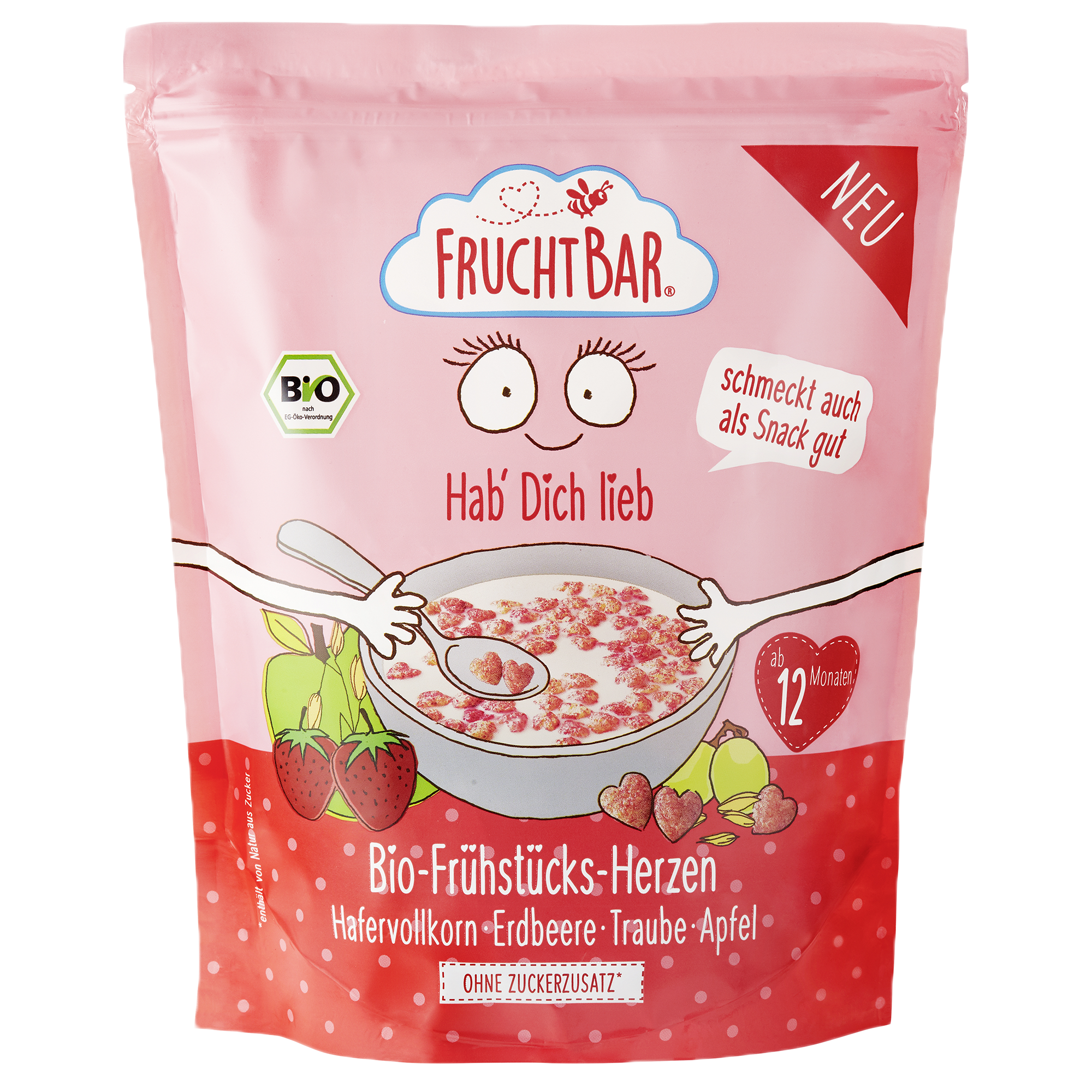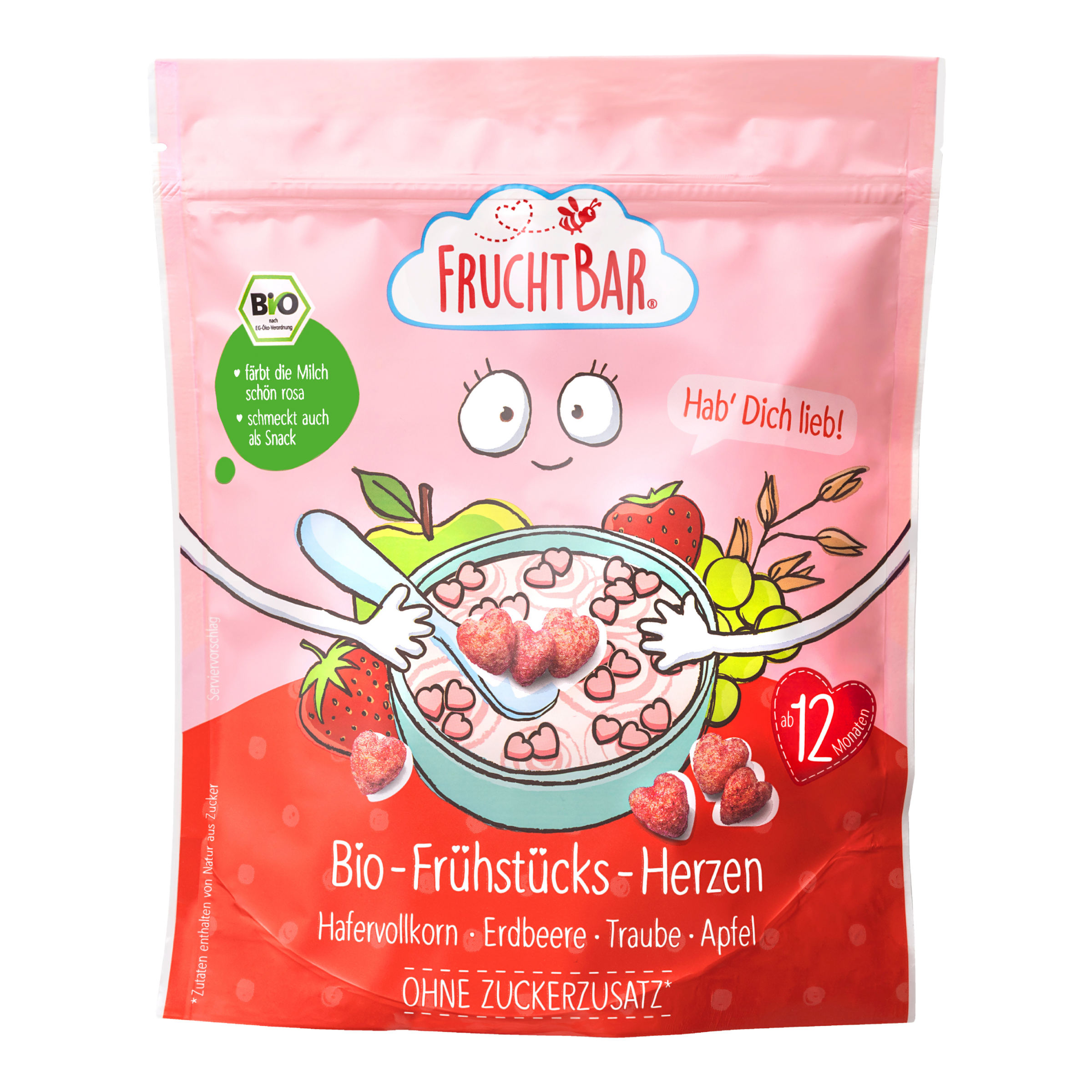 BIO Cereálie srdíčka s jahodami, hroznovým vínem a jablkem jsou vhodné pro děti od ukončeného 12. měsíce.