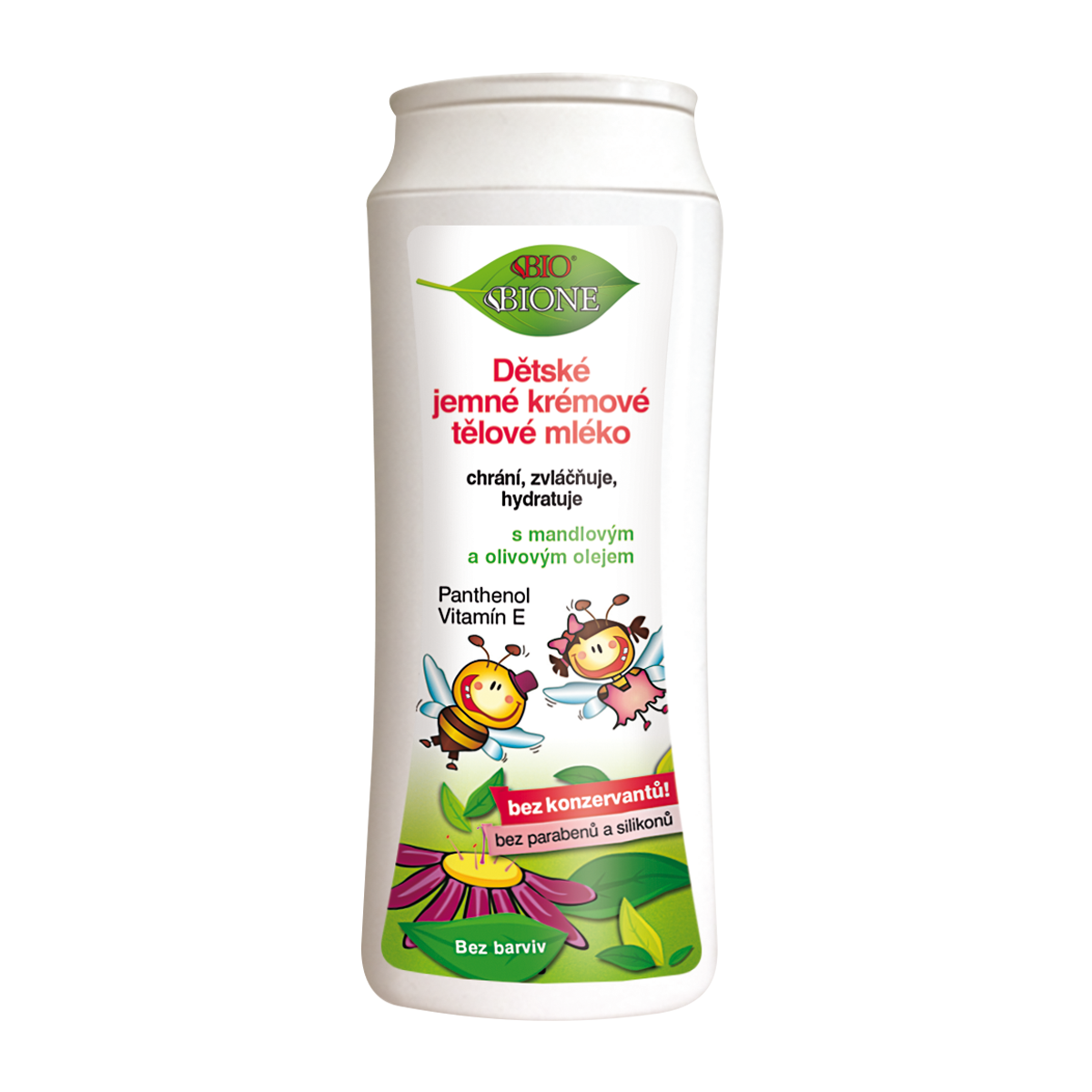 Je velmi lehké, rychle se vstřebávající, určeno pro jemnou dětskou pokožku. Obsahuje pouze vybrané složky, zcela bez neionogenních emulgátorů, s bez alergenní parfemací, s rostlinnými oleji, v moderním ale osvědčeném provedení. Tělové mléko pokožku zvláční a doplní chybějící tuky. Allantoin podporuje obnovu buněk pokožky, glycerin a panthenol hydratují, vitamín E chrání před volnými radikály. Dále obsahuje vzácné bambucké máslo, olivový a mandlový olej a unikátní oleoamin, k podpoře hydratace a regenerace pokožky. Po použití bude pokožka děťátka vláčná, hydratovaná a ochráněná. Mléko je vyrobeno jako extra lehký emulgel, s využitím unikátního emulzního a stabilizačního BIO systému rostlinného polysacharidu a sójového lecitinu. Díky tomu je mléko velmi jemné. Ukládejte na chladném místě, chraňte před dětmi. Neobsahuje barviva, s výhradně bez alergenní parfemací.
