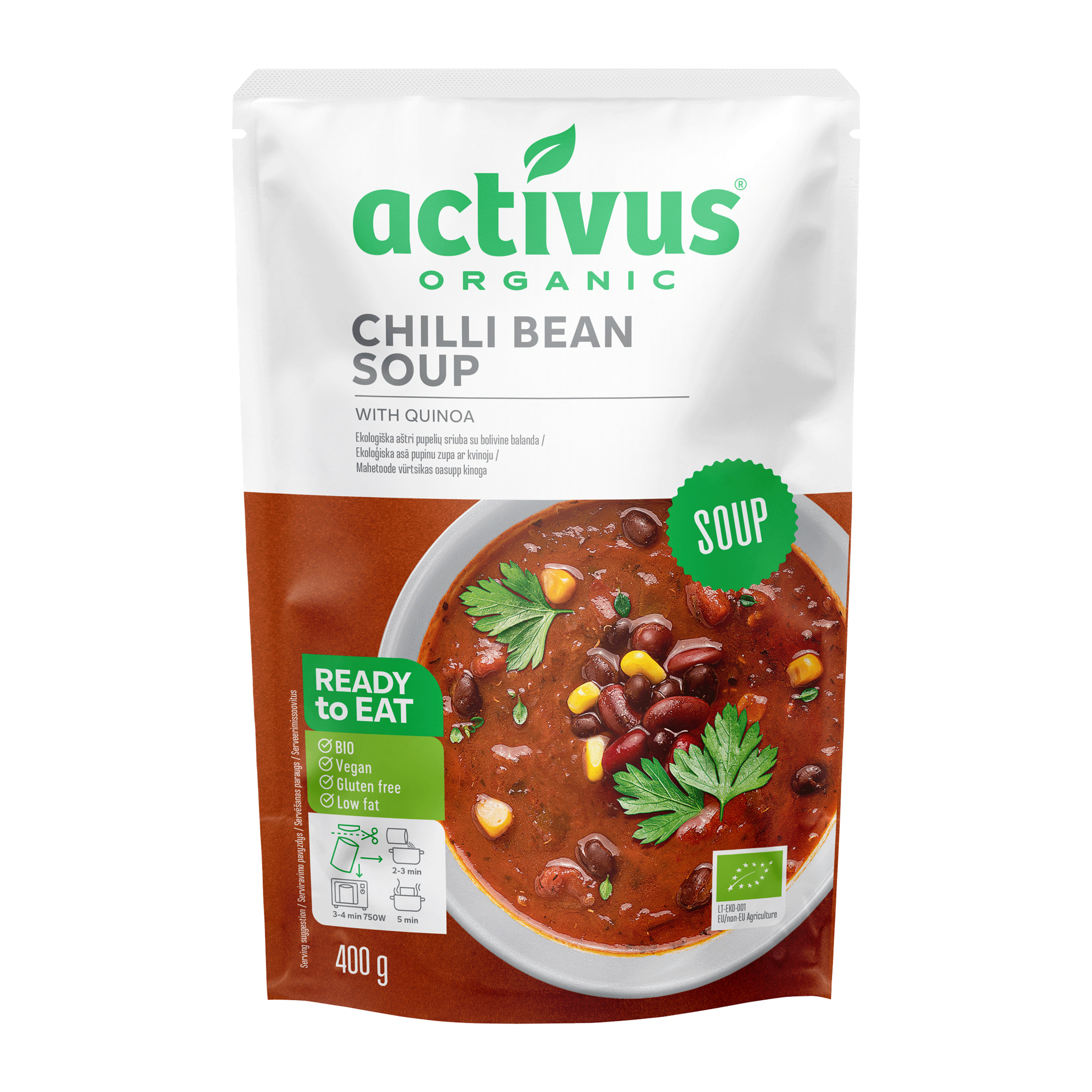 Tato veganská chilli fazolová polévka s quinoou je inspirována mexickou kuchyní. Je ideální pro milovníky kořeněného jídla, kteří hledají alternativu k tradiční chilli polévce bez masa. Výhodou je také obal. Polévka je zabalena v inovativním odlehčeném sáčku. Bylo prokázáno, že tento vak má během životního cyklu produktu výrazně nižší emise CO2 ve srovnání se skleněnou nádobou podobné velikosti.