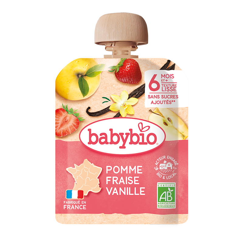 Ovocný bio příkrm od 6. měsíce v praktické 90g kapsičce. Svěží lahodné receptury z bio ovoce zrajícího na lokálních francouzských ekofarmách. Bez umělých konzervantů, bez zahušťovadel a dochucovadel. Bez přidaného cukru. Bio výživa pro kojence od ukončeného 6. měsíce. Ovocné pyré ze šťavnatých jablek a slaďoučkých jahod jsme dovedli k dokonalosti špetkou vanilky. Navíc je v praktických kapsičkách, které bez problémů zabalíte na cesty. Výrobek ekologického zemědělství. Určeno pro zvláštní výživu kojenců a malých dětí. Bez přidaného cukru. Bez palmového oleje. Bez přidané soli. Bez chemických konzervačních látek, dochucovadel, zahušťovadel a barviv. Garance Babybio: Ekologická výživa pro kojence. 25 let odborných zkušeností. Známý původ surovin. Receptury vyvíjené ve spolupráci s francouzskými pediatry a nutričními odborníky. Vyrobeno ve Francii. Baleno v ochranné atmosféře. Obaly neobsahují BPA. Každá nově vyrobená výrobní šarže podléhá laboratornímu rozboru přímo u výrobce, než je uvolněna do prodeje.