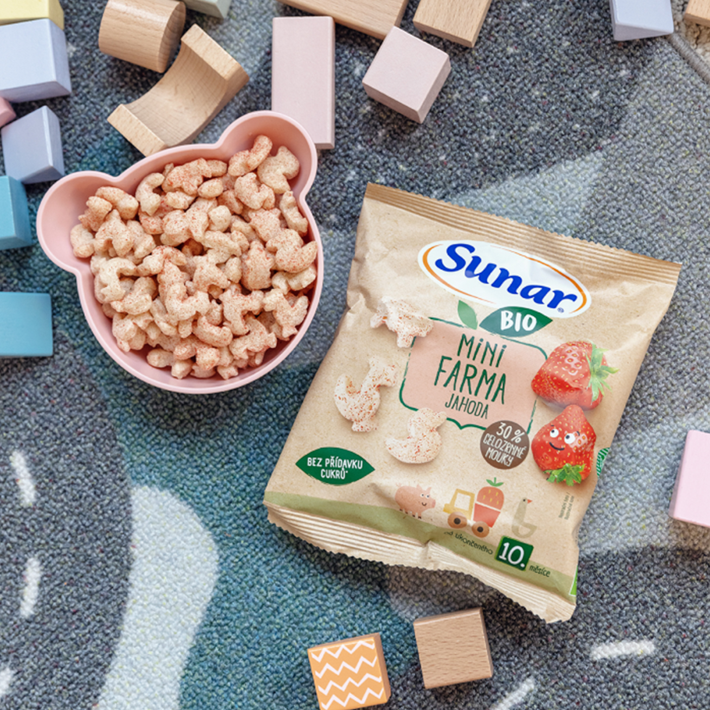Sunar BIO křupky jsou výbornou svačinkou pro ty nejmenší děti. Obsahují více než 30% celozrnné cereální mouky a jsou proto vhodné pro seznámení s lepkem ve výživě. Samozřejmostí je složení bez přidaného cukru a soli. Unikátní hravé tvary křupek umožňují snadné uchopení, čímž podporují rozvoj jemných motorických schopností a samostatnost při jídle.