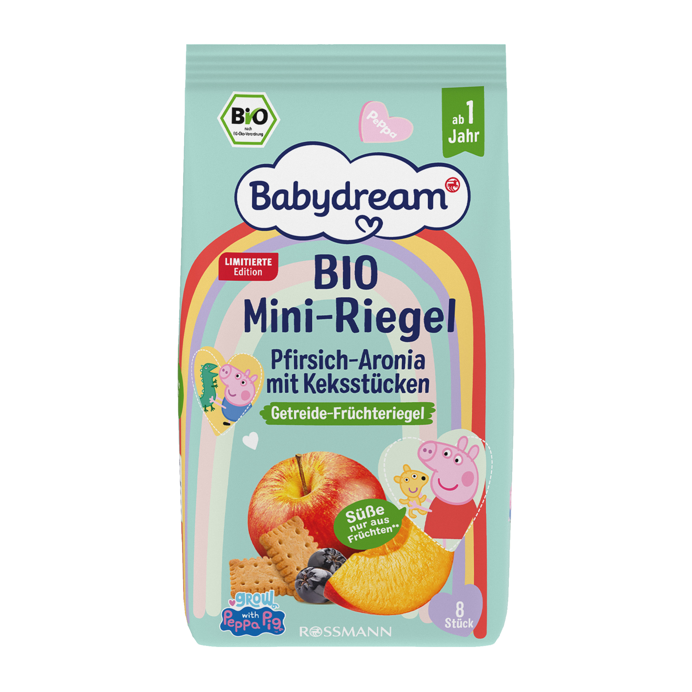 Bio mini tyčinky s broskví, aronií a kousky sušenek Peppa Pig