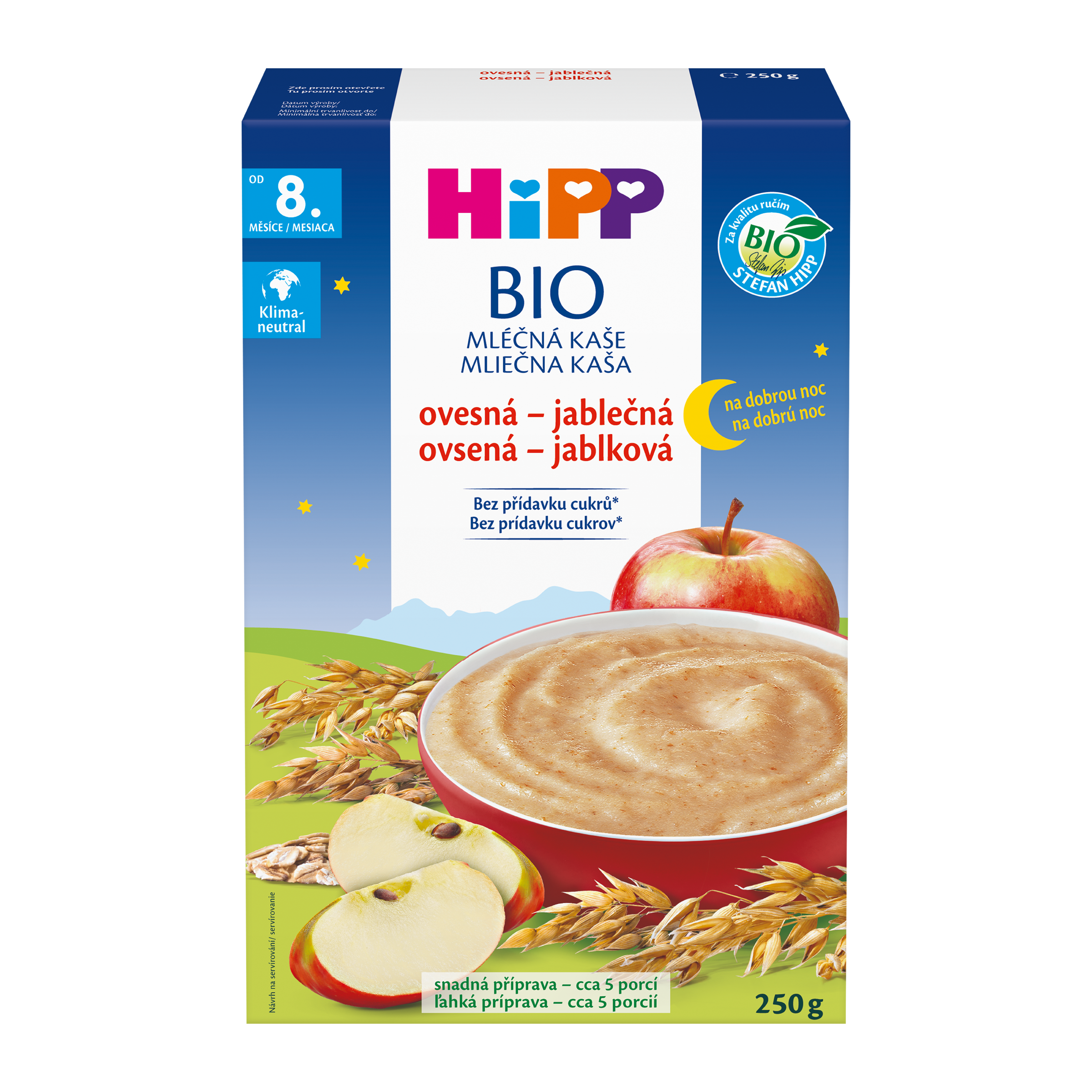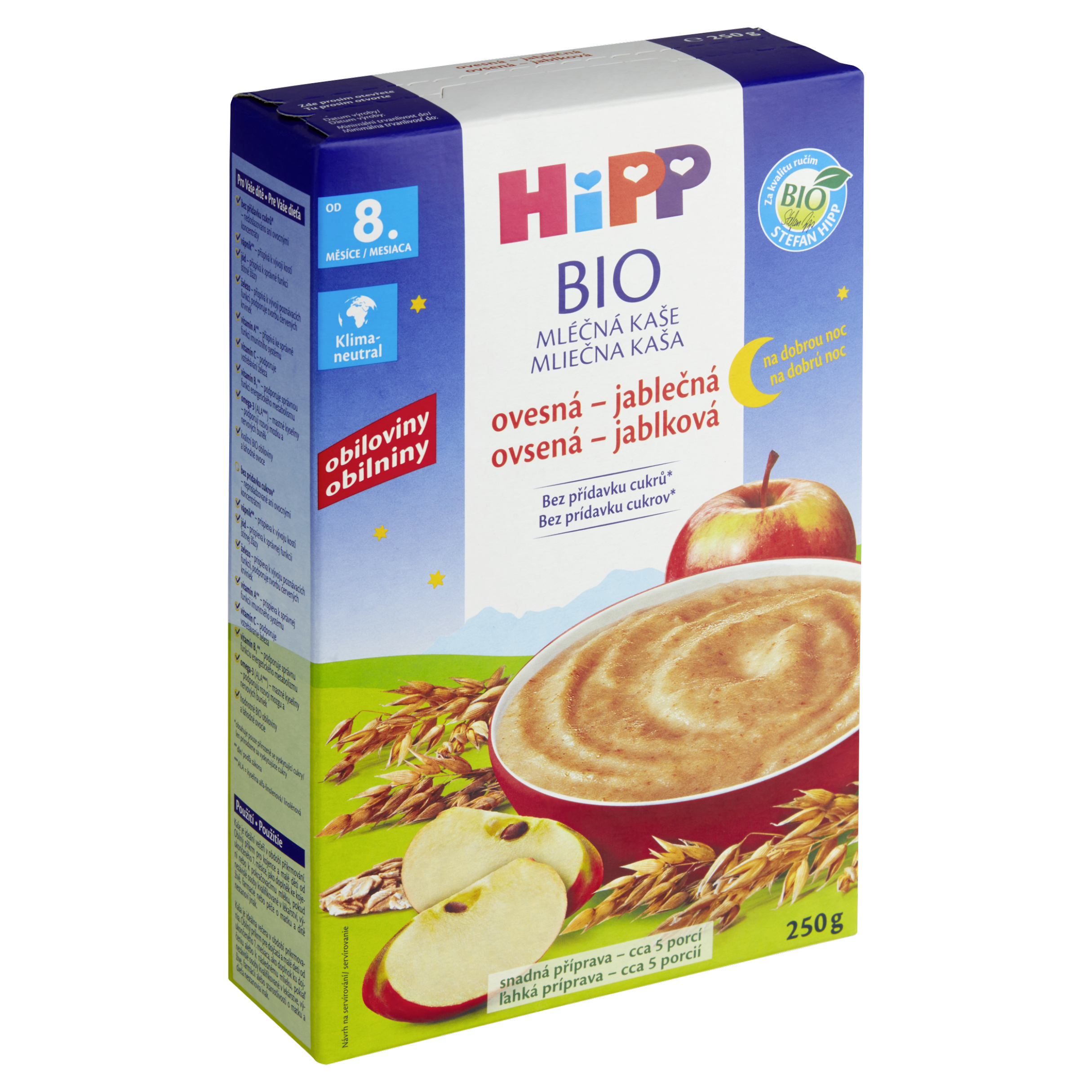 Bio Obiloviny Obiloviny jsou důležitou složkou vyvážené stravy - vnější vrstvy obilovin jsou bohaté na vitaminy a další živiny. HiPP Bio Mléčná kaše ovesná - jablečná na dobrou noc je hodnotná večeře, velmi dobře zasytí a navíc neobsahuje žádný přidaný cukr. Ideální večeře v období přikrmování.