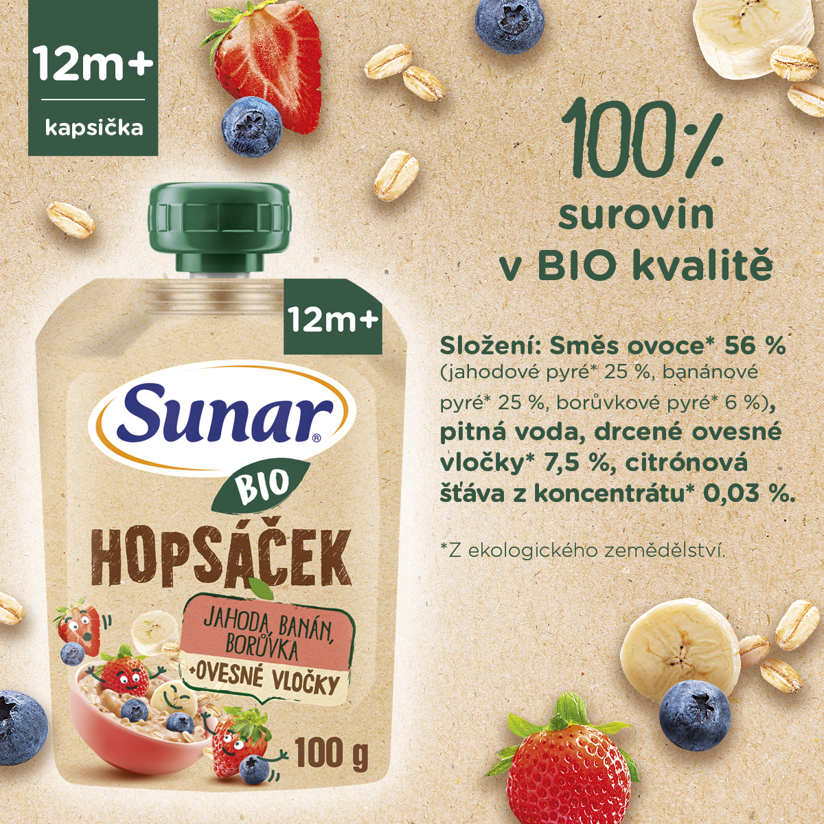 Sunar BIO kapsička Hopsáček je lahodná kombinace ovocného pyré a ovesných vloček v BIO kvalitě, která zažene hlad a dodá dlouhotrvající energii na hopsání po celý den. Bez přidaného cukru. Pro děti od ukončeného 12. měsíce.