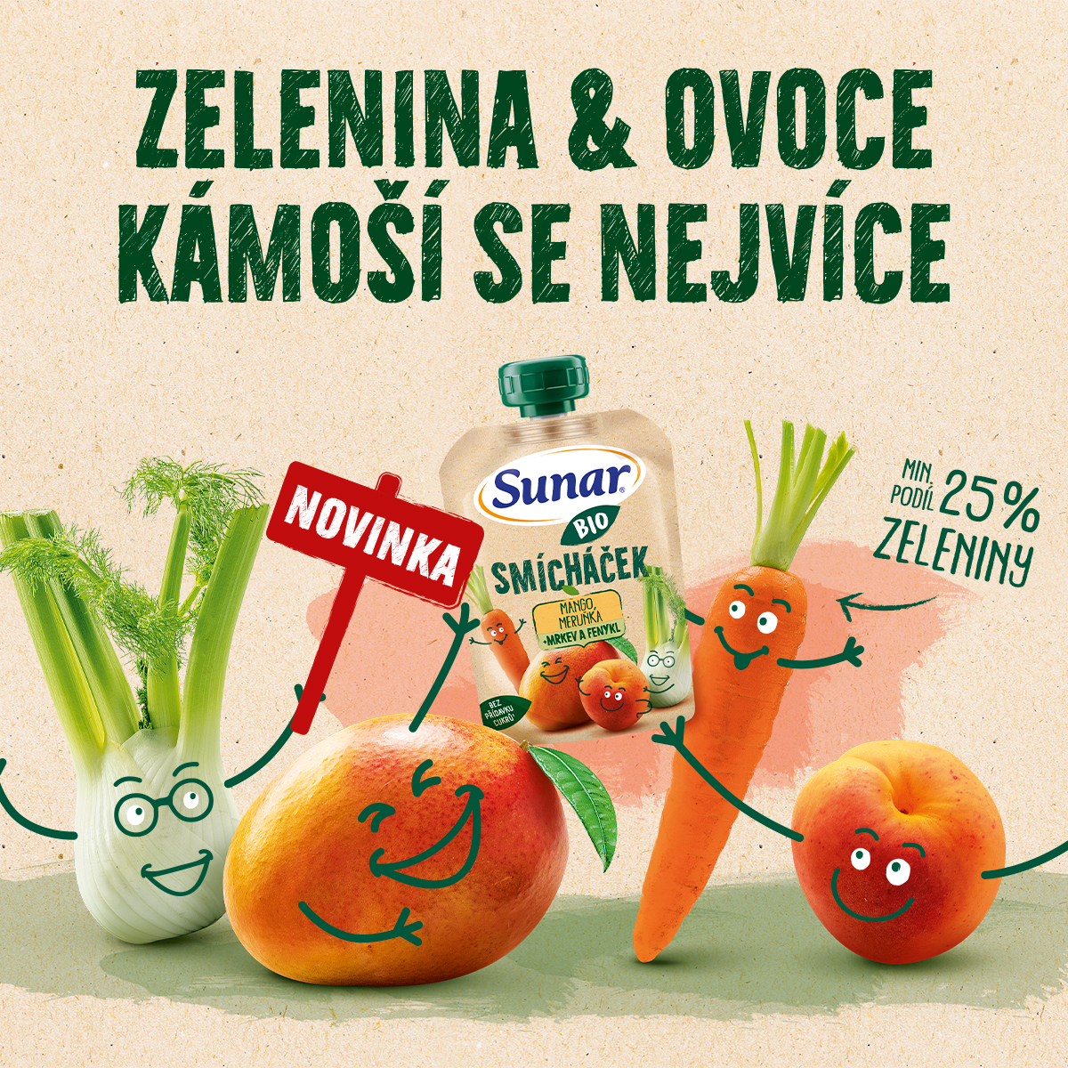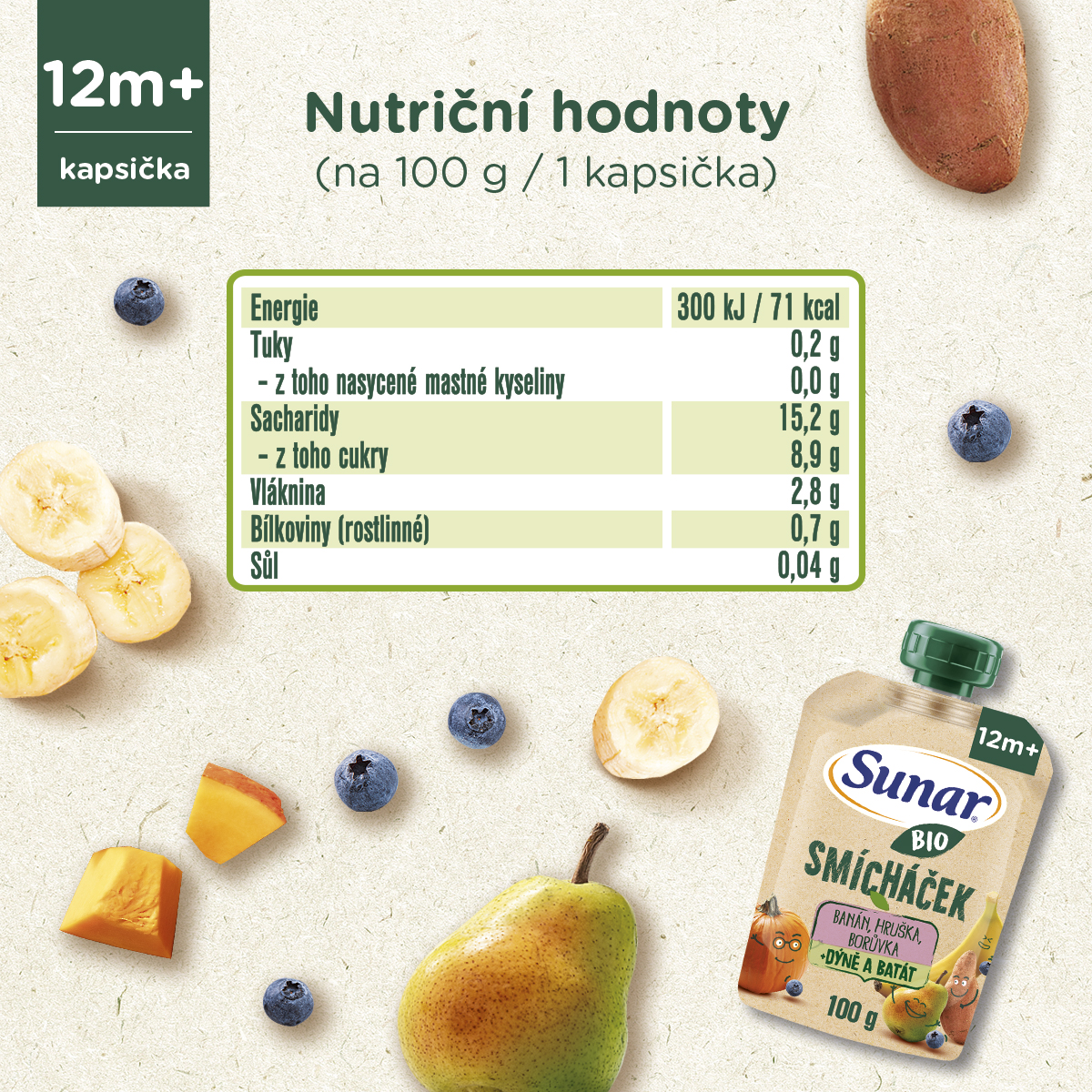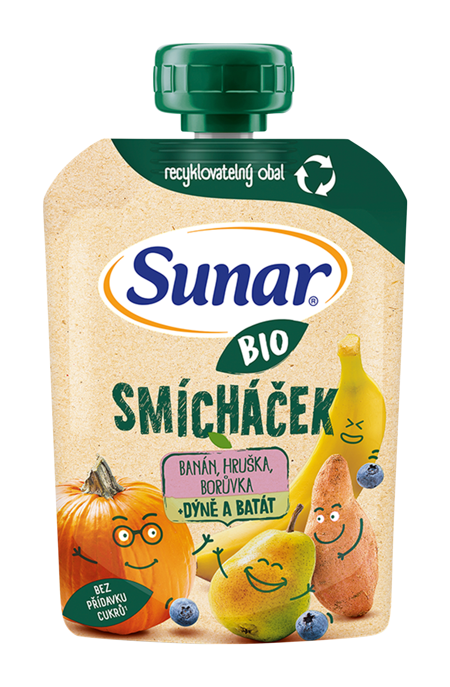 Sunar BIO Smícháček je kapsička kombinující ovoce se zeleninou v lahodnou svačinku v BIO baby kvalitě, která obsahuje minimálně 25% zeleniny. Dostat zeleninu do jídelníčku malých dětí je nyní jednoduché a chutné zároveň. Bez přidaného cukru. Pro děti od ukončeného 12. měsíce.