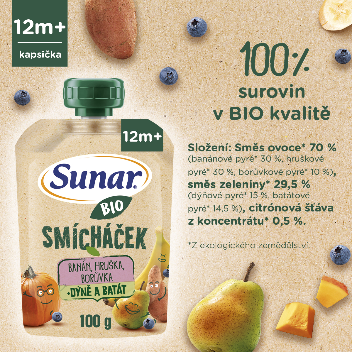 BIO ovocná kapsička Smícháček banán, hruška, dýně, batáty a borůvky