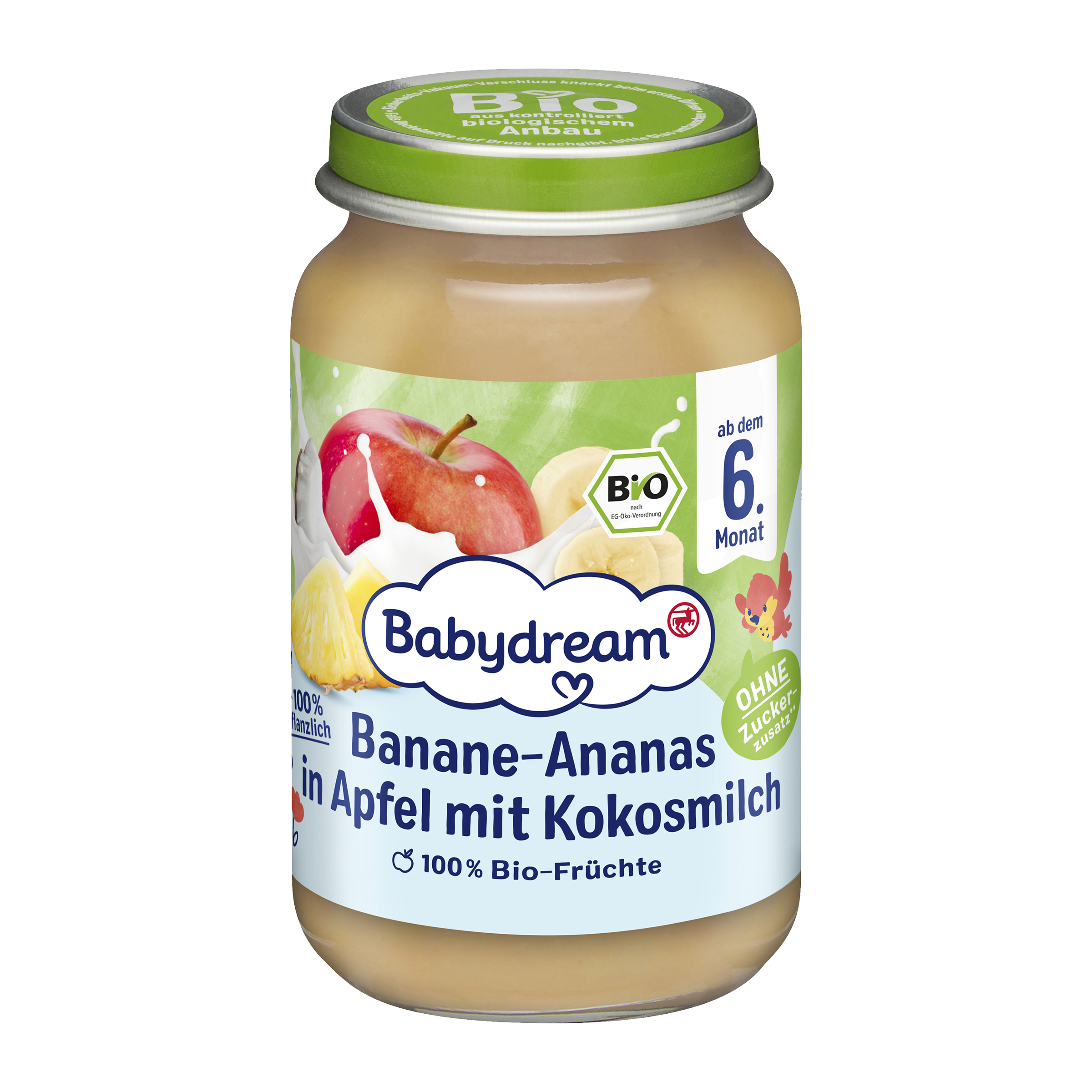 Jablka* 72 %, banány* 14 %, ananas* 7 %, kokosové mléko* (kokosový extrakt* 65 %, voda) 7 %, koncentrát citronové šťávy*.