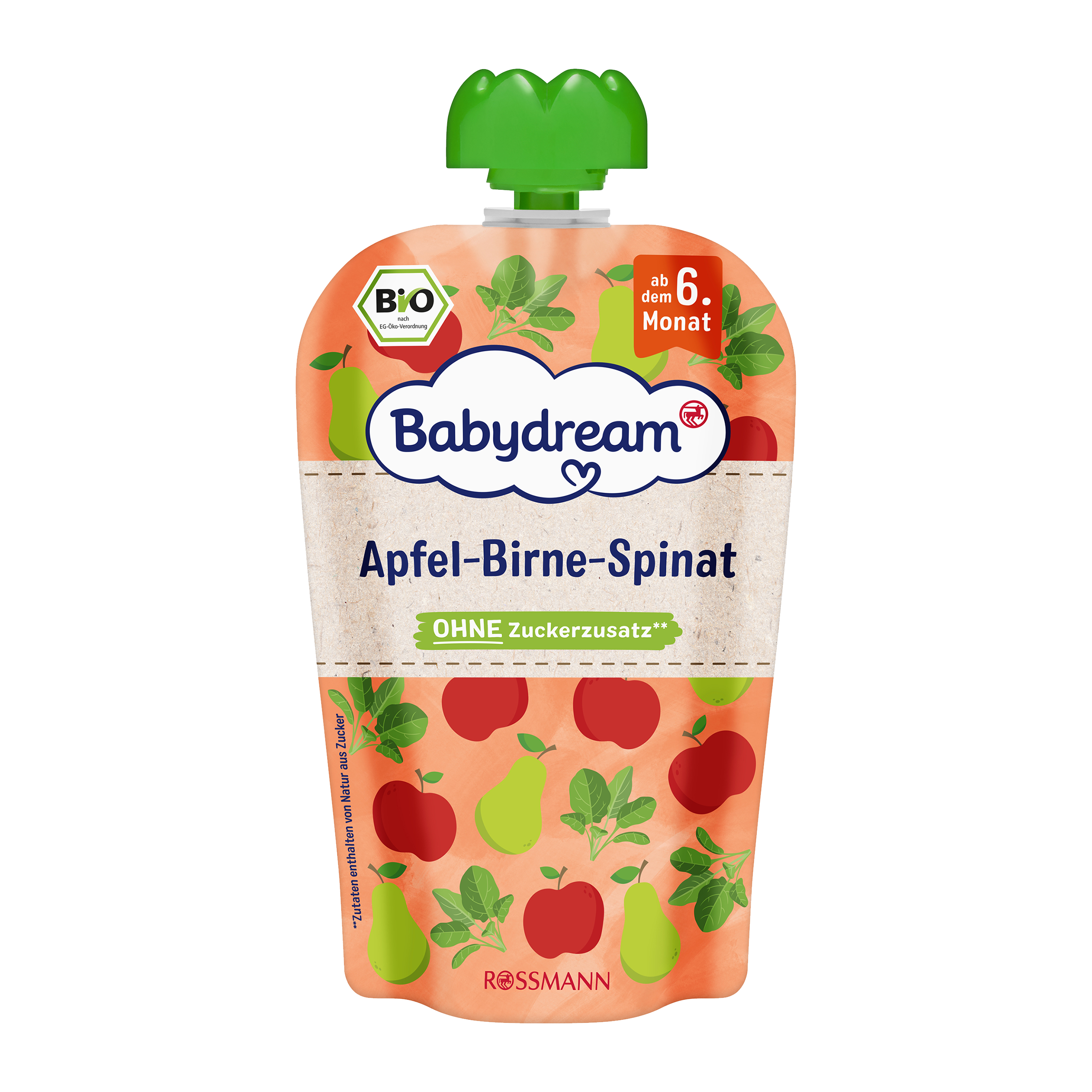 Jablka* 70,9 %, hrušky* 17 %; špenát 9 %, kukuřice* 3 %, koncentrát citronové šťávy*. *z kontrolovaného ekologického pěstování