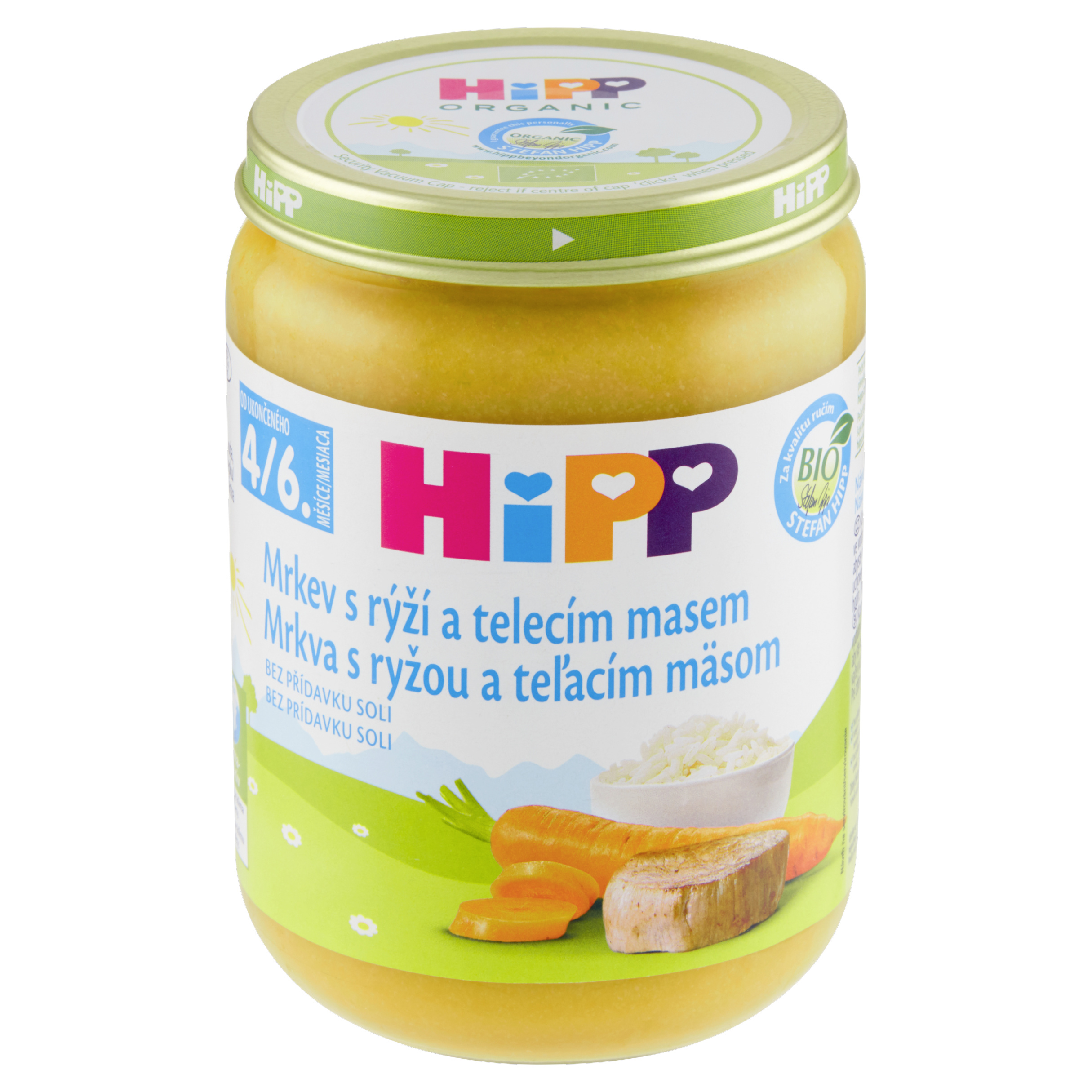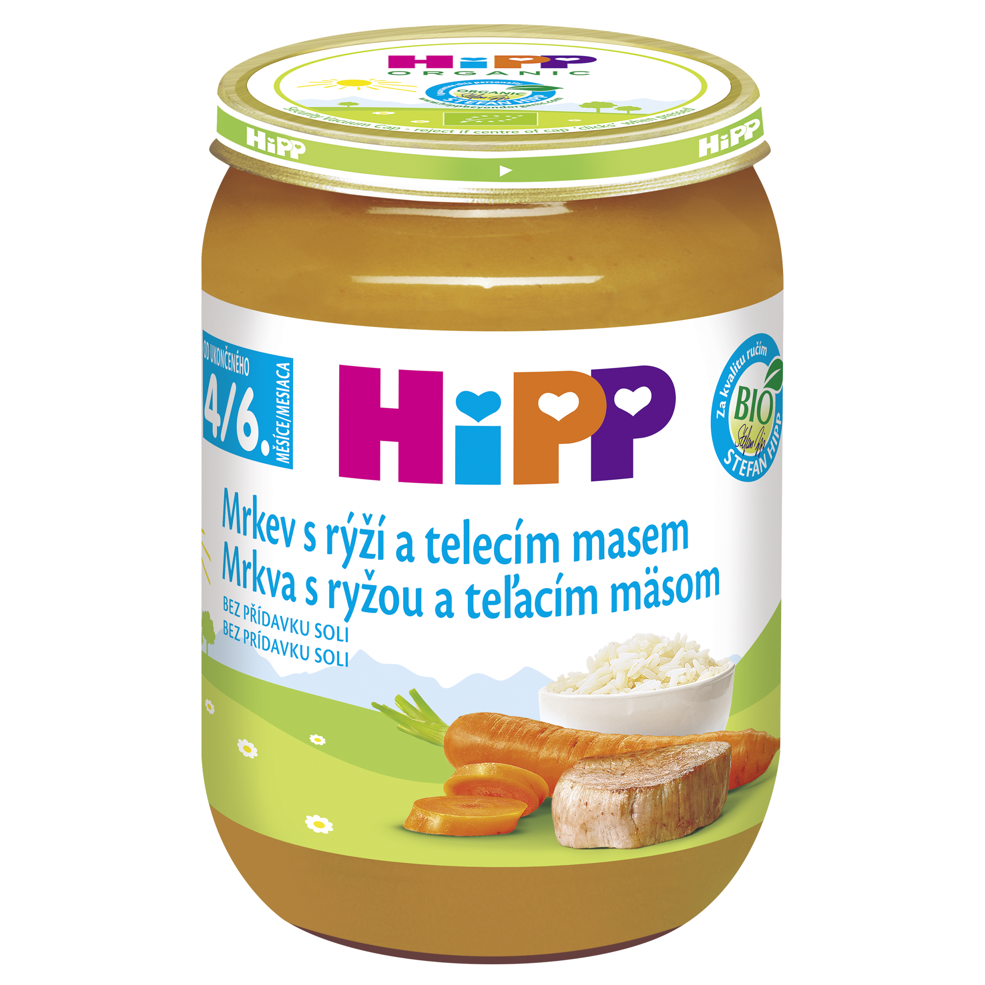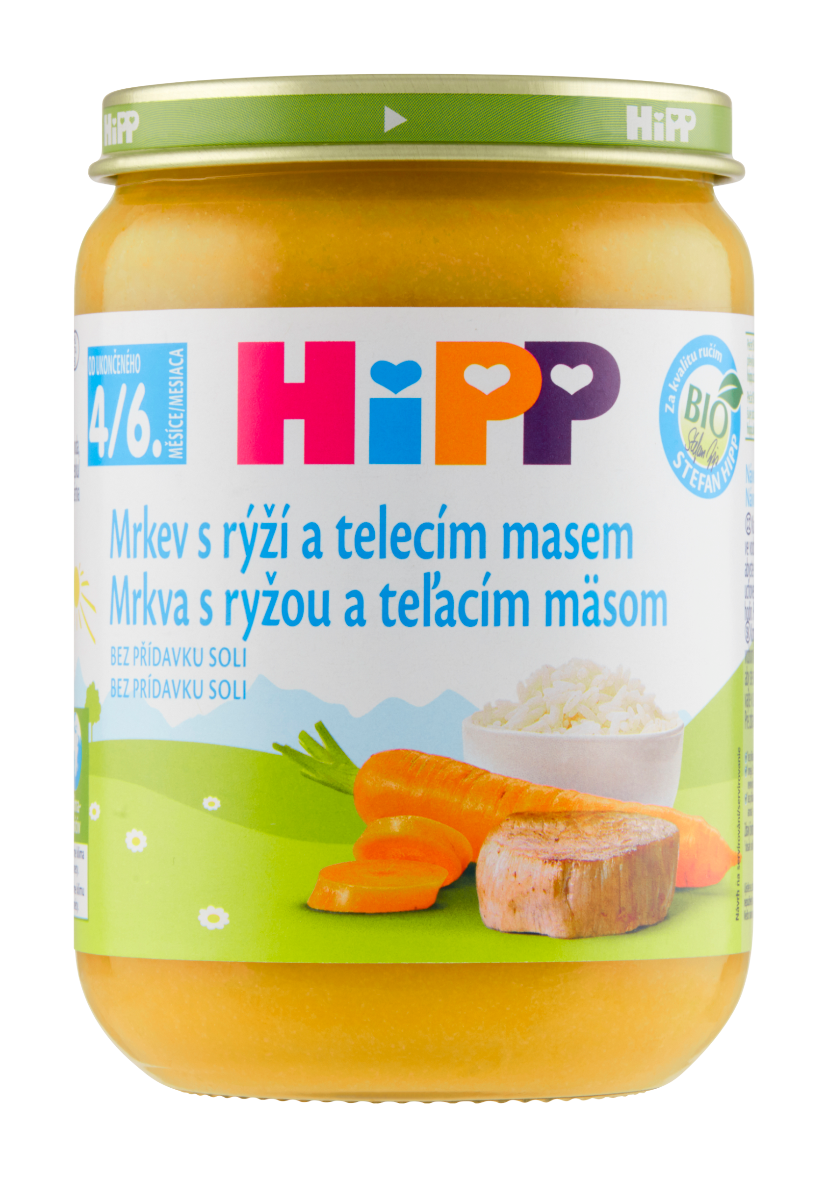 Mrkev* 32 %, Vařená rýže* 30 %, Voda, Telecí maso* 8 %, Řepkový olej* 2.1 %, *z ekologického zemědělství