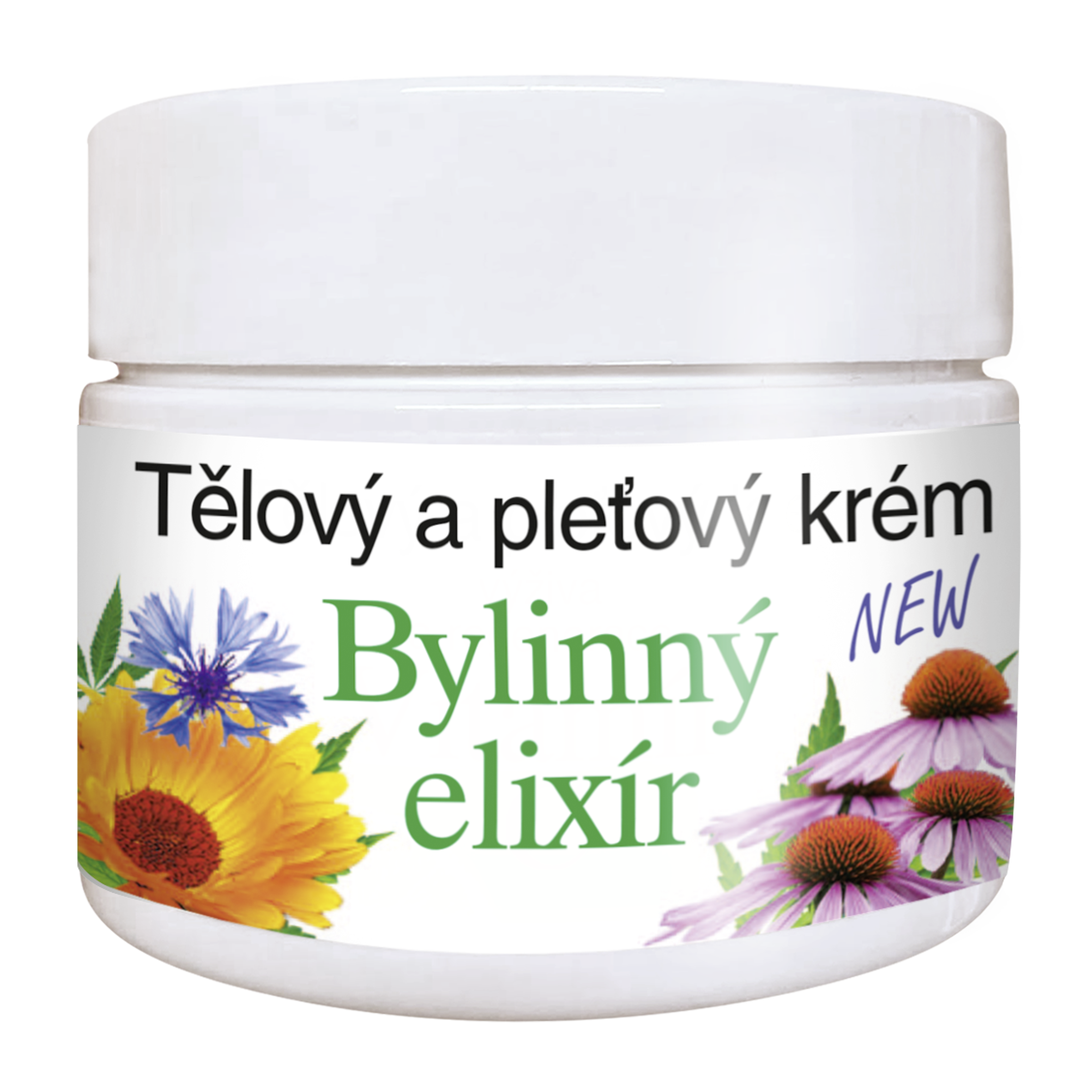 Bylinný elixír je středně tučný, výživný, ochranný a hydratační tělový a pleťový krém s univerzálním použitím. Bylinkový krém s oblíbenými extrakty ze středoevropských bylin, s častým výskytem v kosmetice, nyní všechny spolu pro maximalizaci jejich blahodárných účinků. Spolu s dalšími složkami – hydratační glycerin, rostlinné bambucké máslo, panthenol, allantoin, vitamín E a další vitamíny a fosfolipidy z klíčkového oleje, se podílejí na zvláčnění zvlhčení a ochraně jemné pokožky těla. Krém obsahuje extrakt, olej nebo silici z těchto bylin: cannabis, měsíček, růže, světlík, echinacea, arnika, pampeliška, heřmánek, třezalka a ostropestřec. Bezalergenní parfemace. Šetrný k Vám i k přírodě. Žádný jiný přípravek nemá složení jako tělový a pleťový krém Bylinný elixír. Obsah tukové fáze: do 14 % hm. Obsah neionogenních emulgátorů: 0,0 % hm.