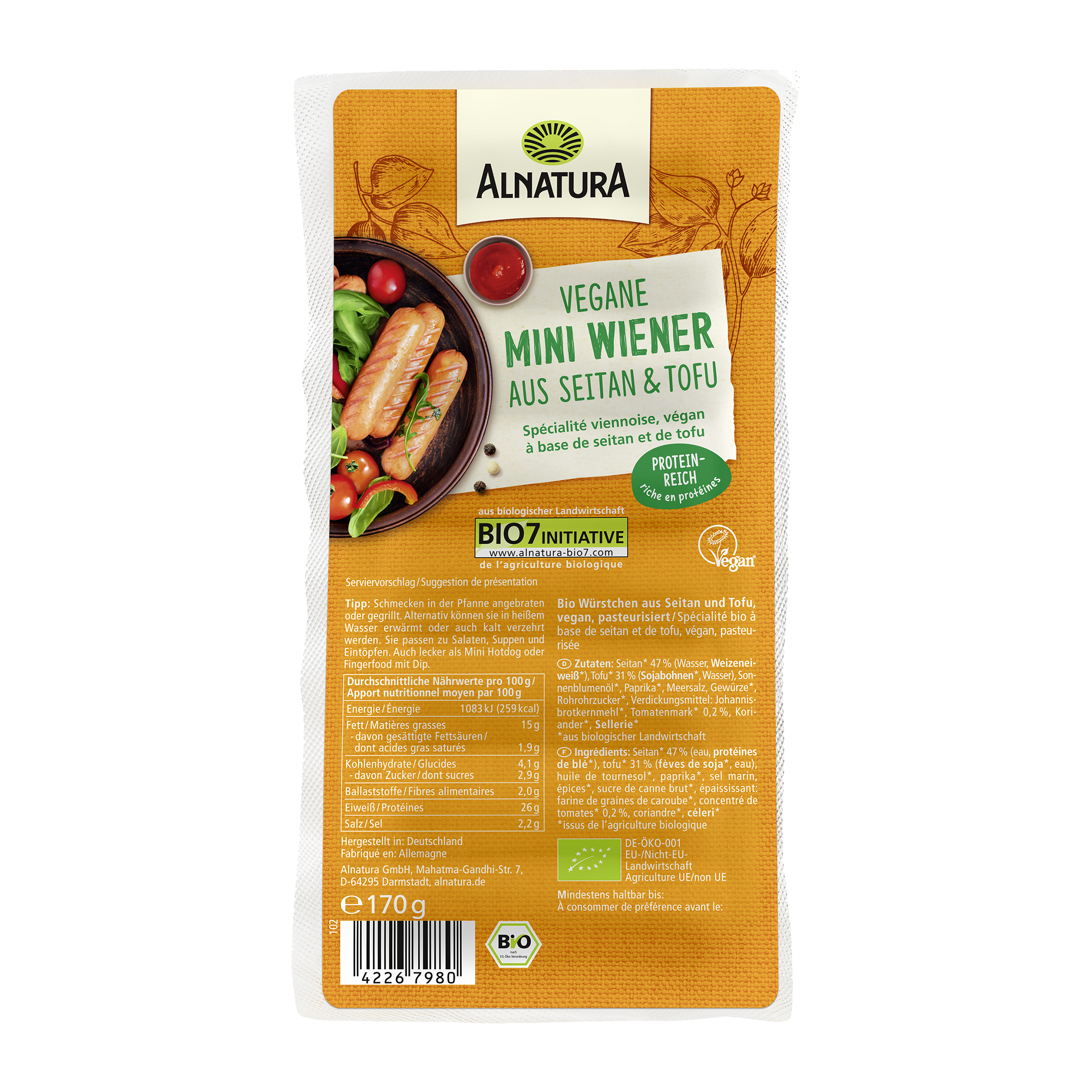 Základem těchto malých veganských klobásek bohatých na bílkoviny, které jsou již pikantní, je tofu a seitan (pšeničná bílkovina). Potřené trochou rostlinného oleje a opečené na pánvi nebo na grilu chutnají skvěle se saláty, zeleninovými pokrmy nebo jednoduše s kari kečupem v housce. Všechny zemědělské suroviny pro nechlazené Vegan Mini Wieners od Alnatury jsou ekologicky pěstované.