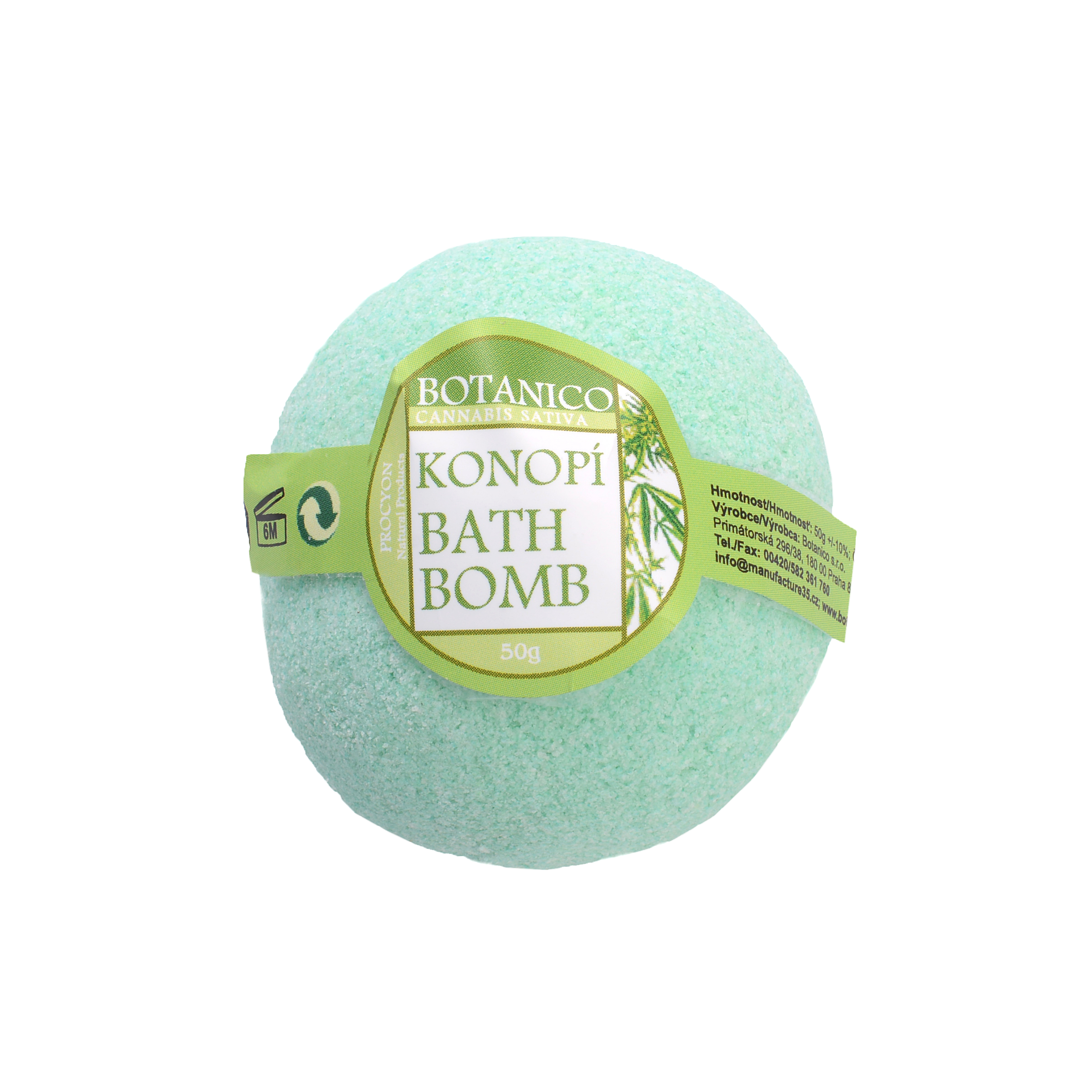 Bath bomb s konopím, které má výrazné protizánětlivé, hojivé, analgetické, antibakteriální a antivirální účinky. Konopí se zvláště dobře osvědčuje při léčbě akné, lupénky, ekzému apod a obsahuje velké množství vzácných nenasycených mastných kyselin, kyseliny linolové a kyseliny stearidonové, dále fytosterolů, minerálů a vitamínů.