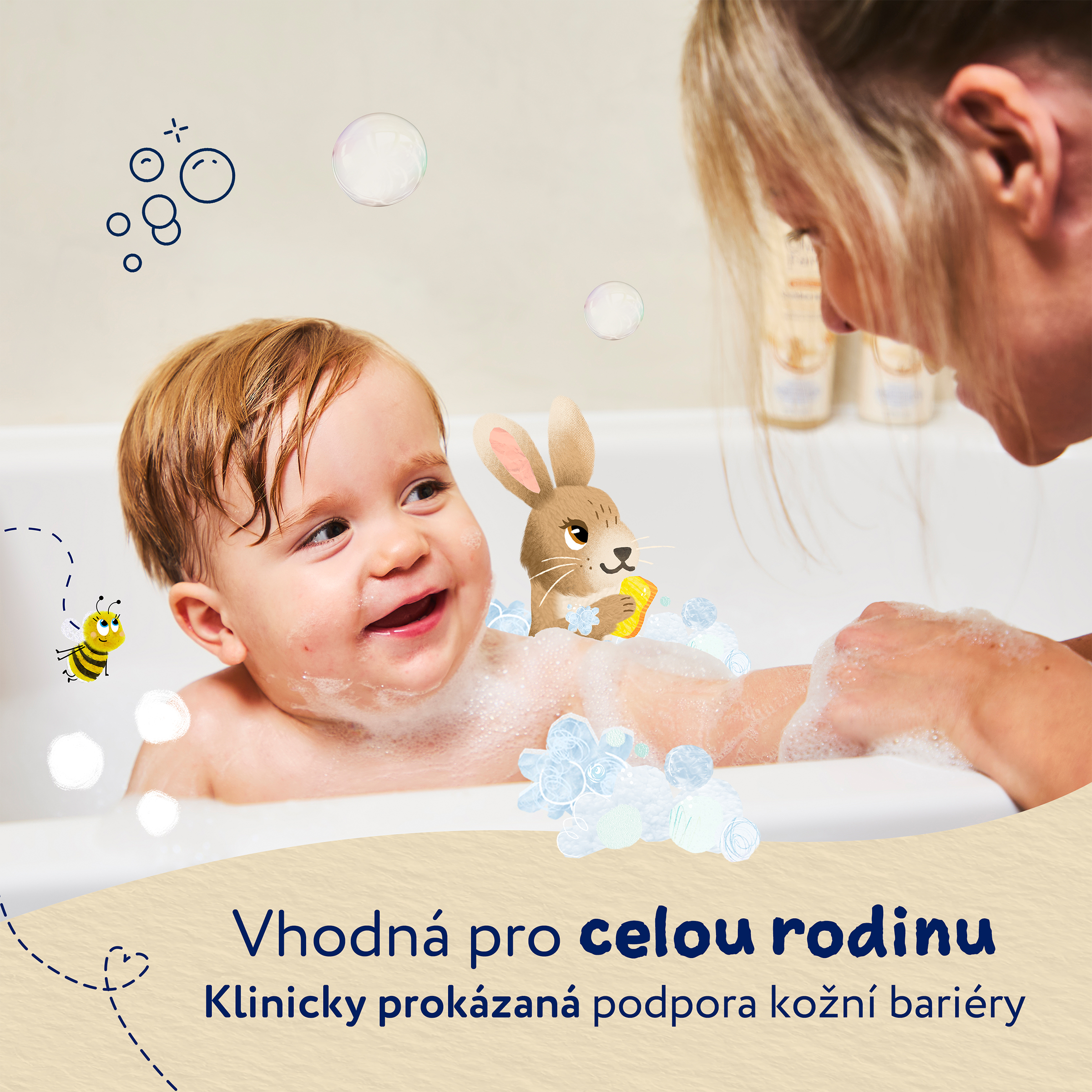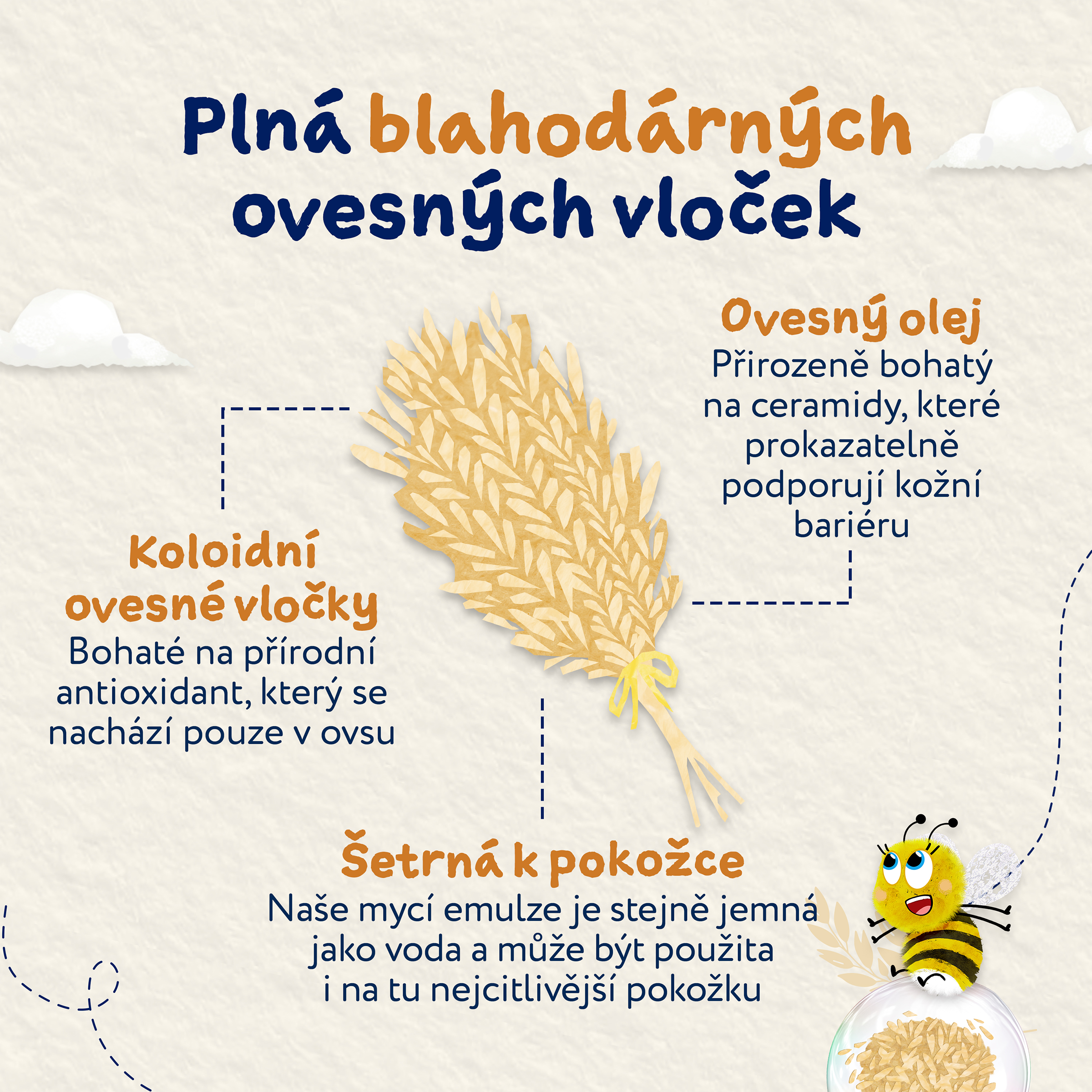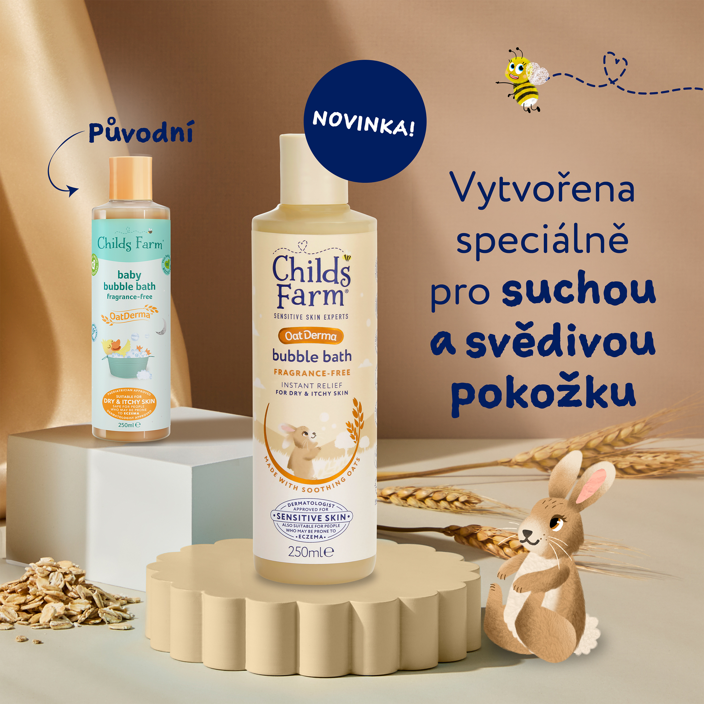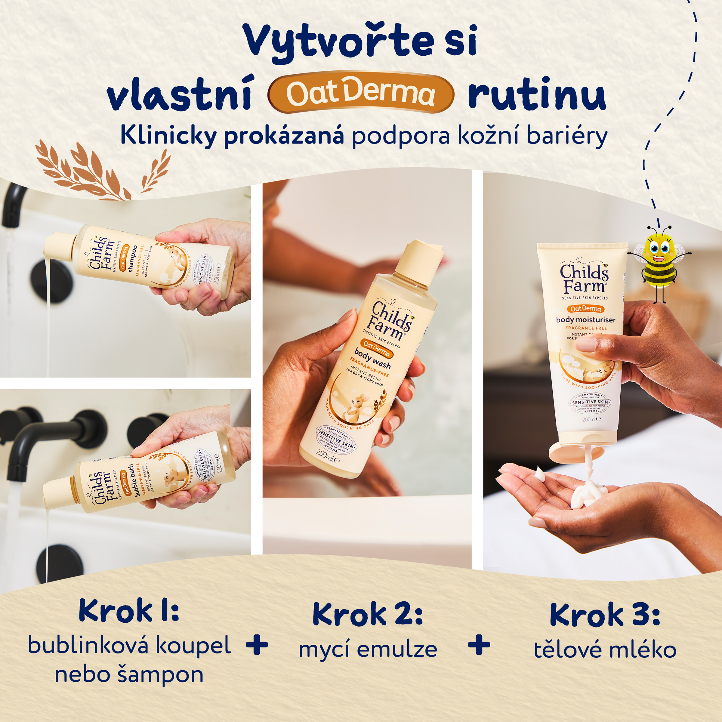 OatDerma™ je řada produktů, která byla vytvořena speciálně pro suchou svědivou pokožku a je vhodná i pro pokožku se sklony k ekzému. Produkty obsahují koloidní ovesné vločky bohaté na betaglukany, které klinicky prokazatelně zklidňují a jemně vyživují citlivou pokožku, a ovesný olej, který pokožce napomáhá se vstřebáním a udržováním vlhkosti. Produkty jsou bez parfemace, jsou schválené dermatology i pediatry a nesou označení vegan a cruelty free. Bublinková koupel je velmi jemná k citlivé pokožce, nevysušuje ji a tak si můžete užít spoustu bublinkové zábavy. Po koupeli je důležité vlhkost uzamknout v pokožce, proto vyzkoušejte i tělové mléko z řady OatDerma™. Bublinková koupel je vhodná již od narození a pro celou rodinu.