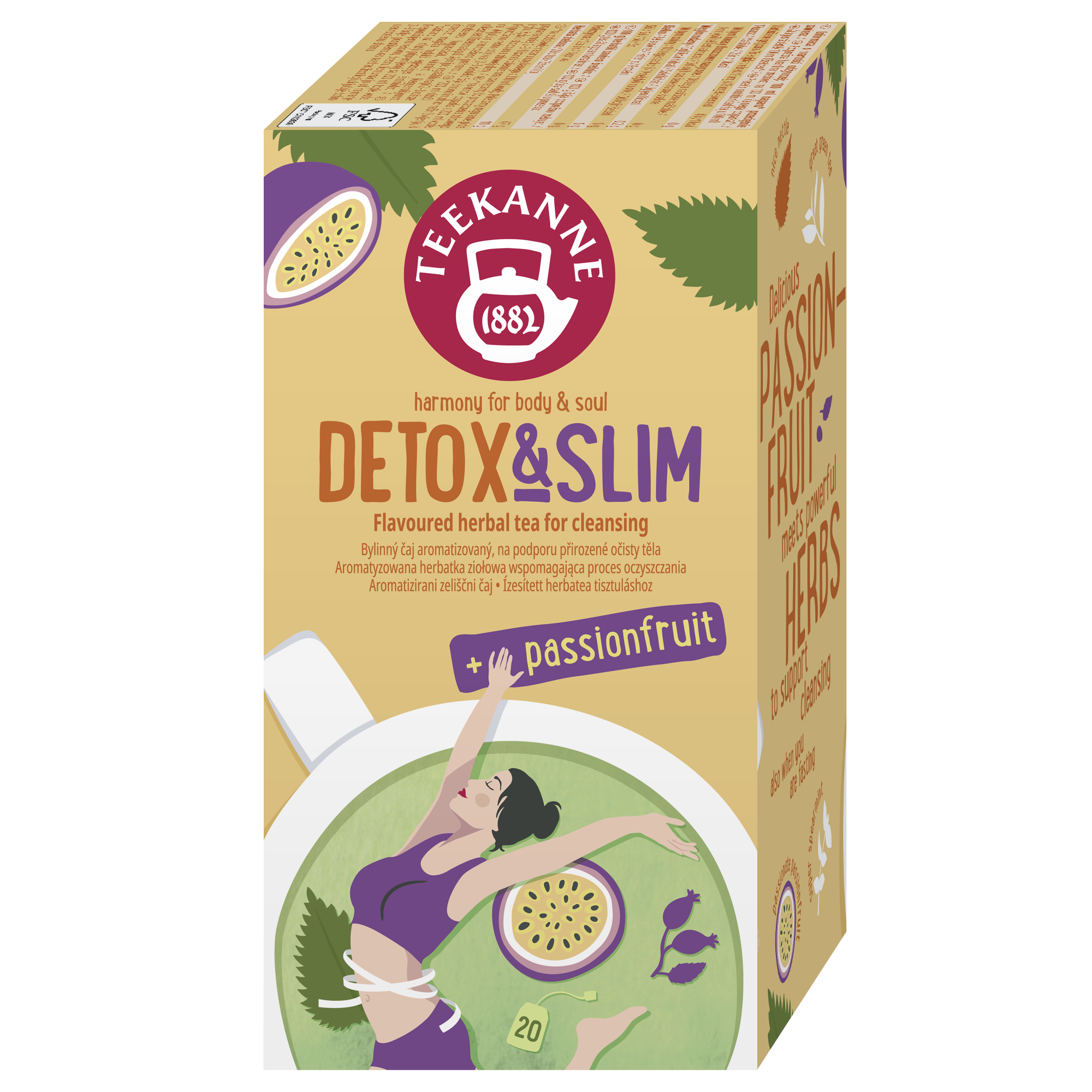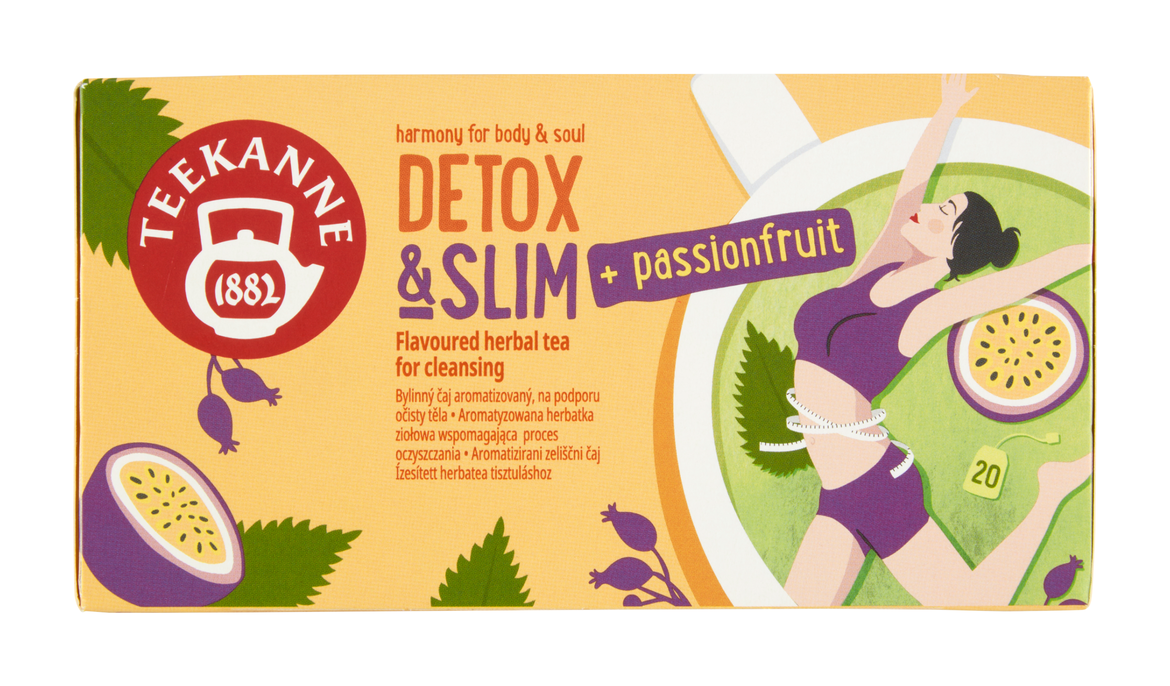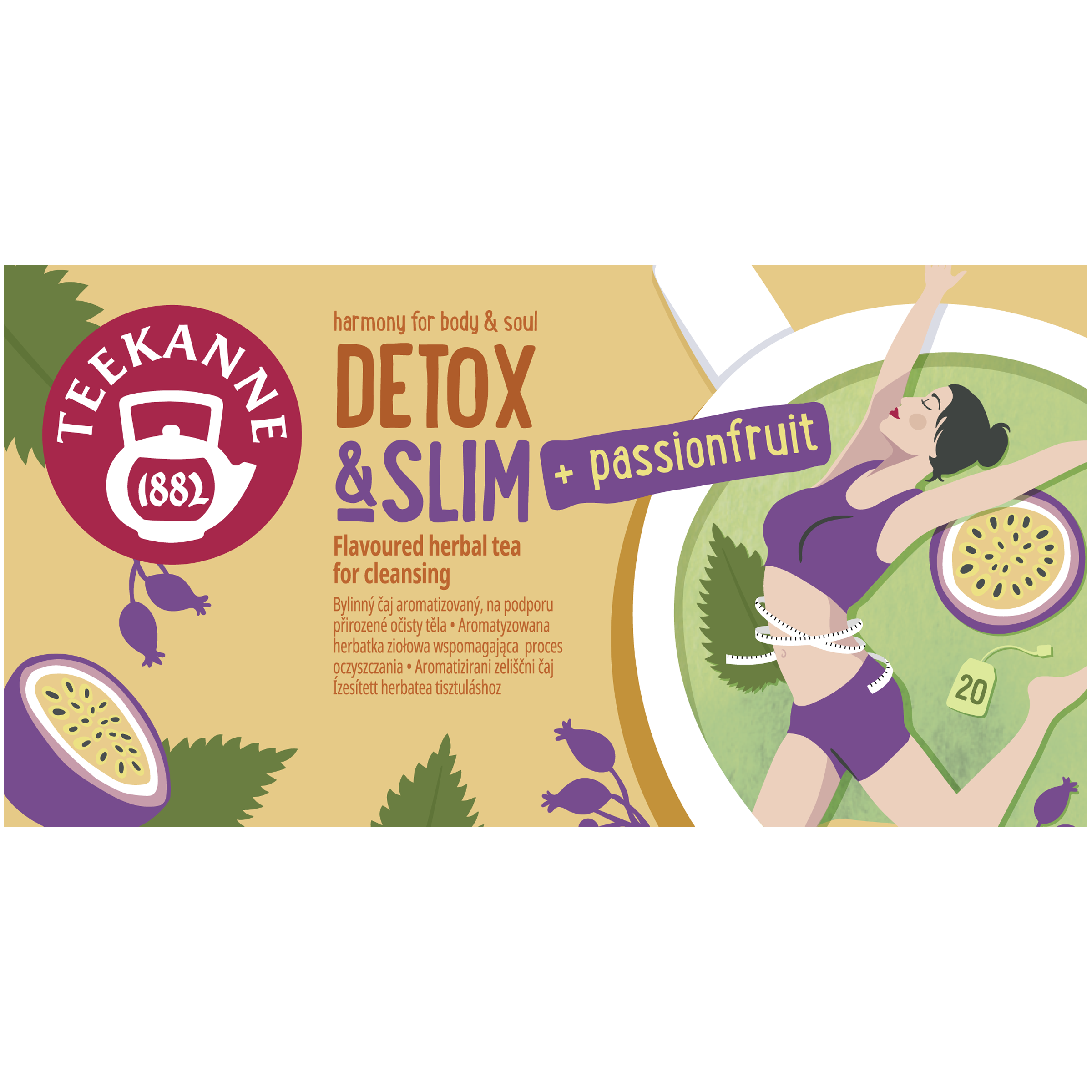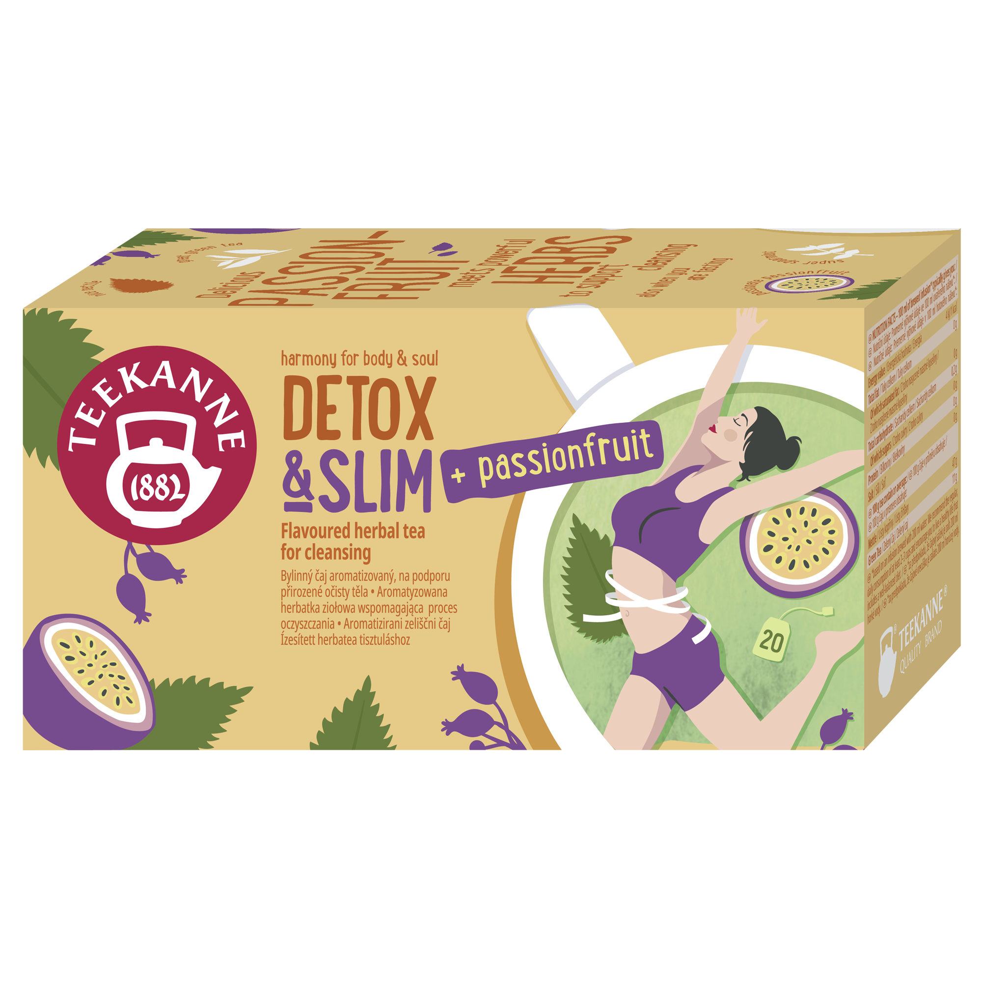 Teekanne Detox & Slim představuje bylinnou směs se zeleným čajem a aroma marakuji. Obsahuje kopřivu, která podporuje vylučování vody z organizmu, zelený čaj (Camelia Sinensis) podporuje metabolismus tuků a tím pomáhá ke kontrole tělesné hmotnosti.