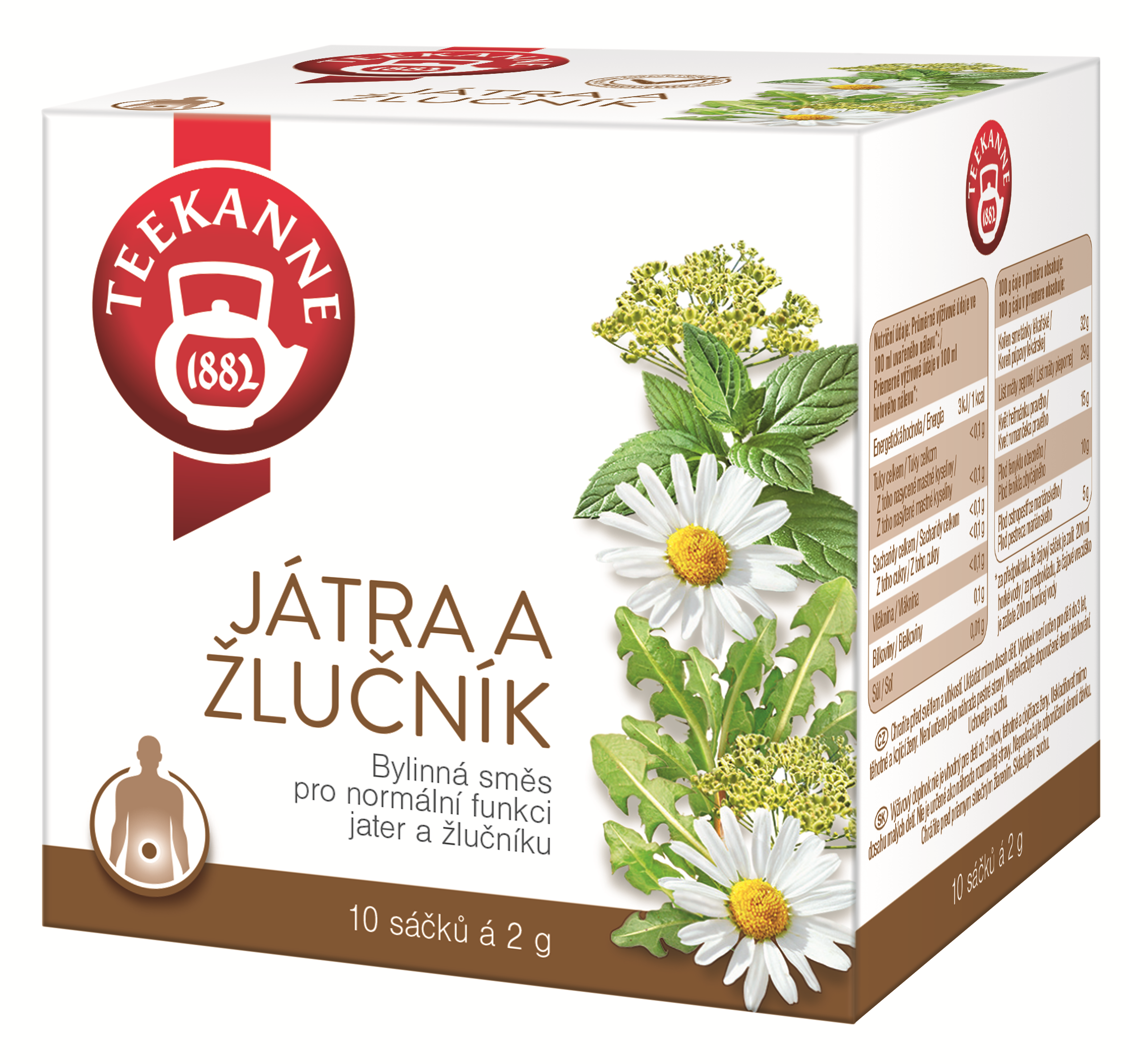 Játra a žlučník Hlavní složky bylinného čaje jsou: Kořen a nať smetánky lékařské stimuluje trávení a přispívá k funkcím střevního traktu. Máta peprná podporuje funkce zažívacího systému, zejména funkce žaludku a střev. Fenykl je přírodním zdrojem pro pohodu Vašeho trávicího systému. Heřmánek pro normální trávení. Plod ostropestřce mariánského přispívá k pročištění jater, pomáhá chránit jejich normální funkci a současně podporuje trávení. Bylinné funkční čaje od TEEKANNE vycházejí z tradičních bylin a jejich účinky jsou již po staletí dobře známy. Příjemná aromatická chuť bylin je to, co dělá z čajů TEEKANNE, ideálního společníka již více než 120 let.