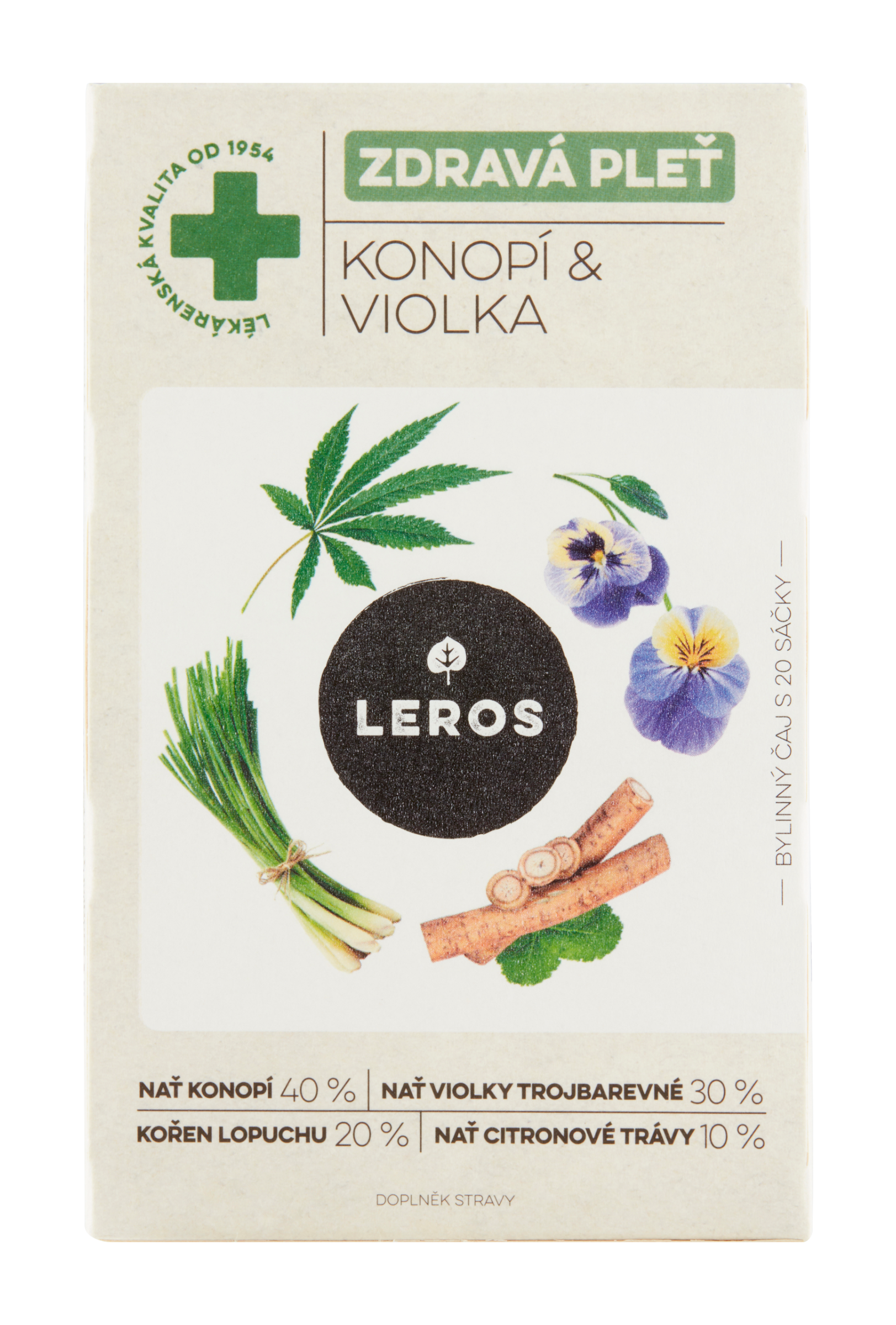Bylinky pro zdravou pleť. Bylinná směs přinášející klid a mír Vaší pleti. Kombinuje konopí se dvěma bylinami tradičně užívanými na kožní problémy - lopuchem větším a violkou trojbarevnou. Směs přispívá ke zdraví Vaší pleti, lze ji též užívat u projevů stárnutí kůže, jako jsou vrásky, nepružná a suchá kůže. Dopřejte své pleti, ať se pomocí bylinek rozzáří. Čas na sebe. Vyberte si hrníček, který potěší Vaše oči. Vložte do něj čajový sáček s bylinkami. Zalijte jej horkou vodou. Osm minut děkujte své pleti za to, jak pěkně vypadá. Pomalu, v klidu vychutnávejte každý doušek tohoto lahodného čaje. Chuť & vůně čaje. Vychutnejte si svěžest citronové trávy v kombinaci s nasládlou chutí lopuchu a kořenitou příchutí violky. Při kratším vyluhování více vynikne svěží konopné aroma spolu s citrusovou vůní, při delším vyluhování se přidá bylinkovost lopuchu a macešky s příjemnou nahořklostí konopí. Lékárenská kvalita od 1954. Receptura NO. 204. Autor receptury PharmDr. Jan Martin, Ph.D.