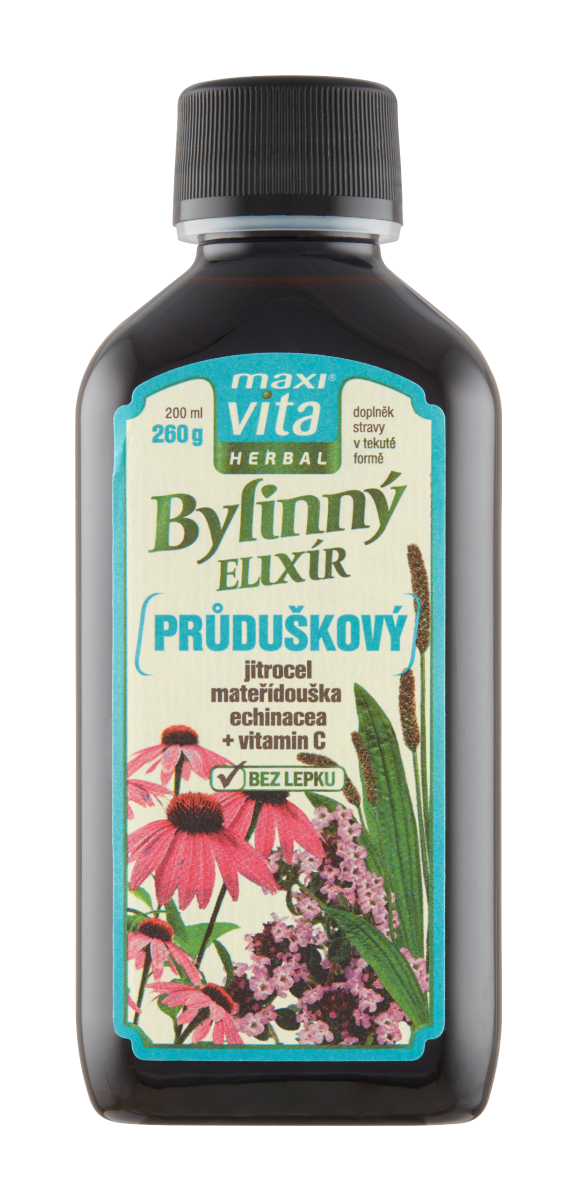 Bylinný elixír průduškový Herbal jitrocel mateřídouška echinacea + vitamin C, doplněk stravy
