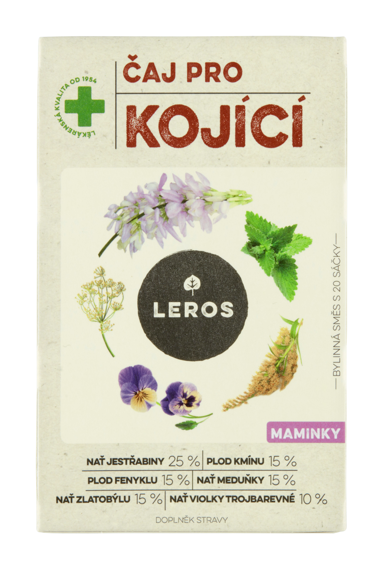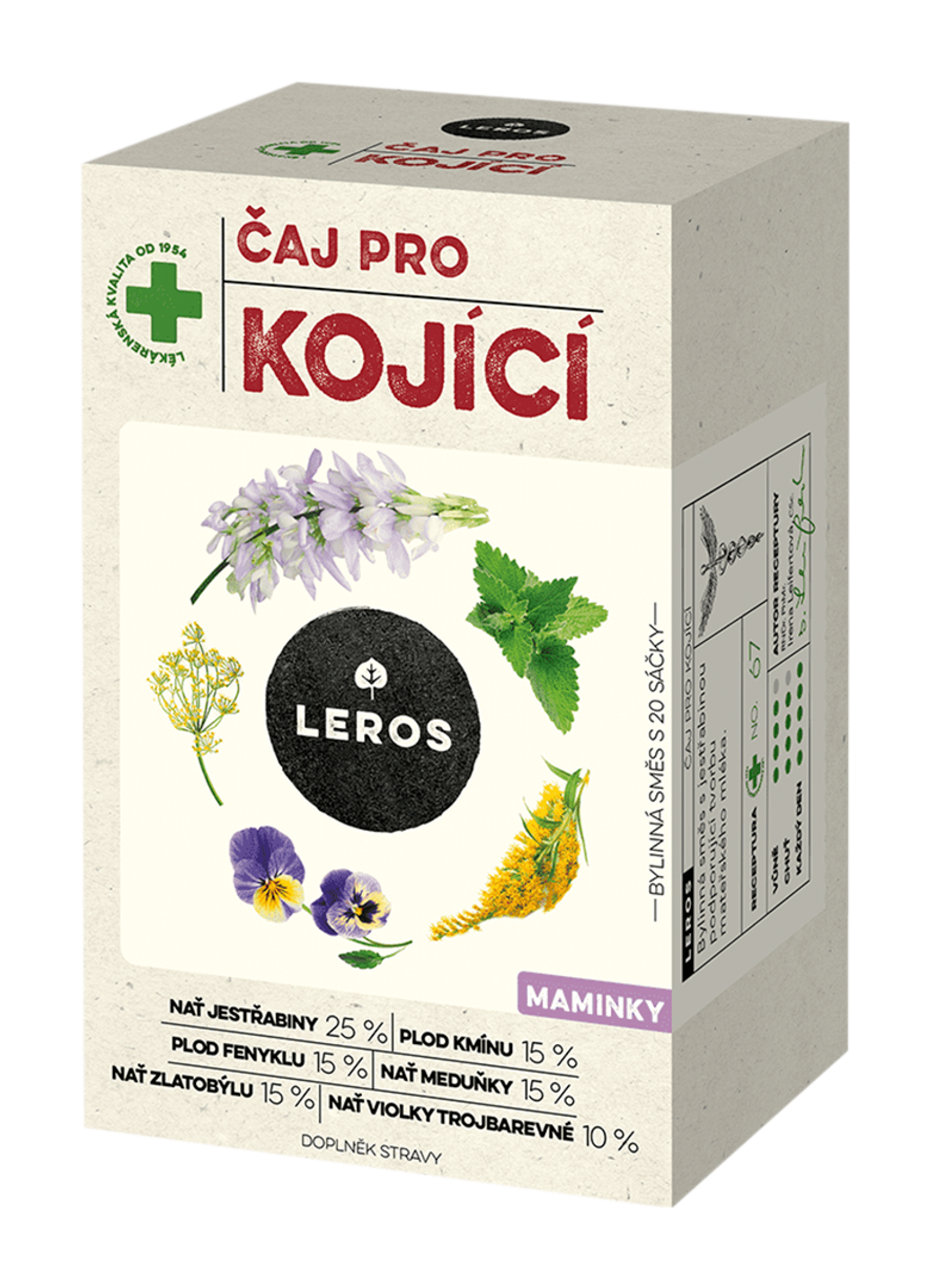 Bylinná směs s jestřabinou podporující tvorbu mateřského mléka. Bylinky pro kojící maminky Vyvážená bylinná směs je vhodná k doplnění pitného režimu kojících maminek. Nať jestřabiny lékařské, kmín a fenykl podporují tvorbu mateřského mléka a přispívají k hladkému trávení. Při kojení přecházejí s mlékem do těla miminka i látky z potravy matky. Všechny bylinky jsou vybrány tak, aby byly k organismu dítěte i maminky co nejšetrnější a zároveň aby měl čaj příjemnou chuť. Čas na sebe Vyberte si hrníček, který potěší Vaše oči. Vložte do něj čajový sáček s bylinkami a zalijte jej vroucí vodou. Na 10 minut se zastavte, pomazlete se se svým miminkem a myslete na to, jak bezpečně se miminko cítí a jak mu kojení přináší pocit klidu. Poté si pomalu, v klidu vychutnávejte každý doušek tohoto lahodného čaje. Chuť & vůně čaje Čaj má příjemnou svěží a nasládlou chuť, v níž dominuje kořenitá jestřabina a fenykl. V jeho vůni se snoubí výrazný fenykl a kmín s medovými tóny meduňky. Čaj má zlatavou barvu dozrávajícího obilí.