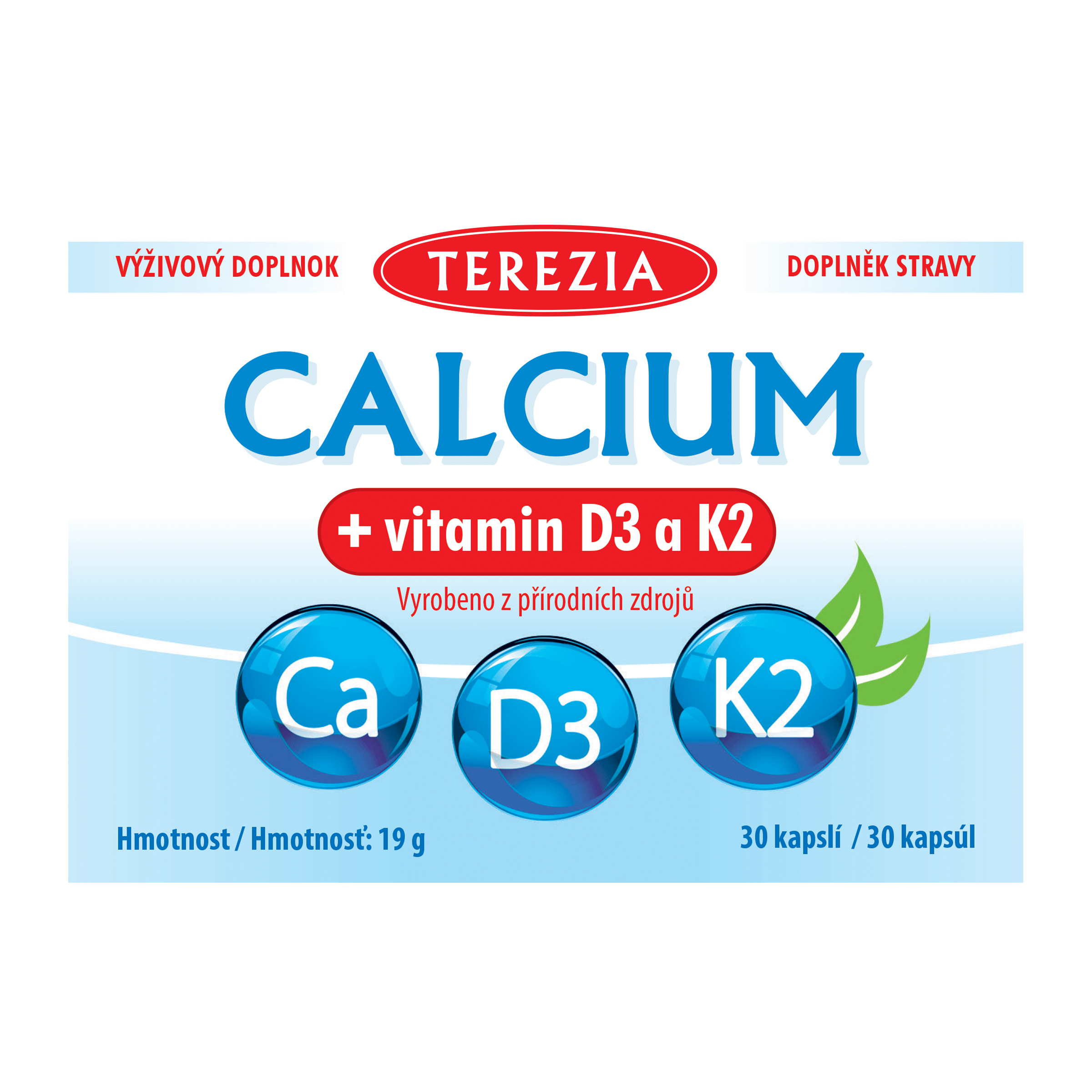 TEREZIA CALCIUM + vitamin D3 a K2 obsahuje přírodní zdroj vápníku pocházejícího z mořské řasy. Díky přírodnímu původu má vysokou vstřebatelnost. Vitaminy D3 a K2 podporují zdravé kosti.