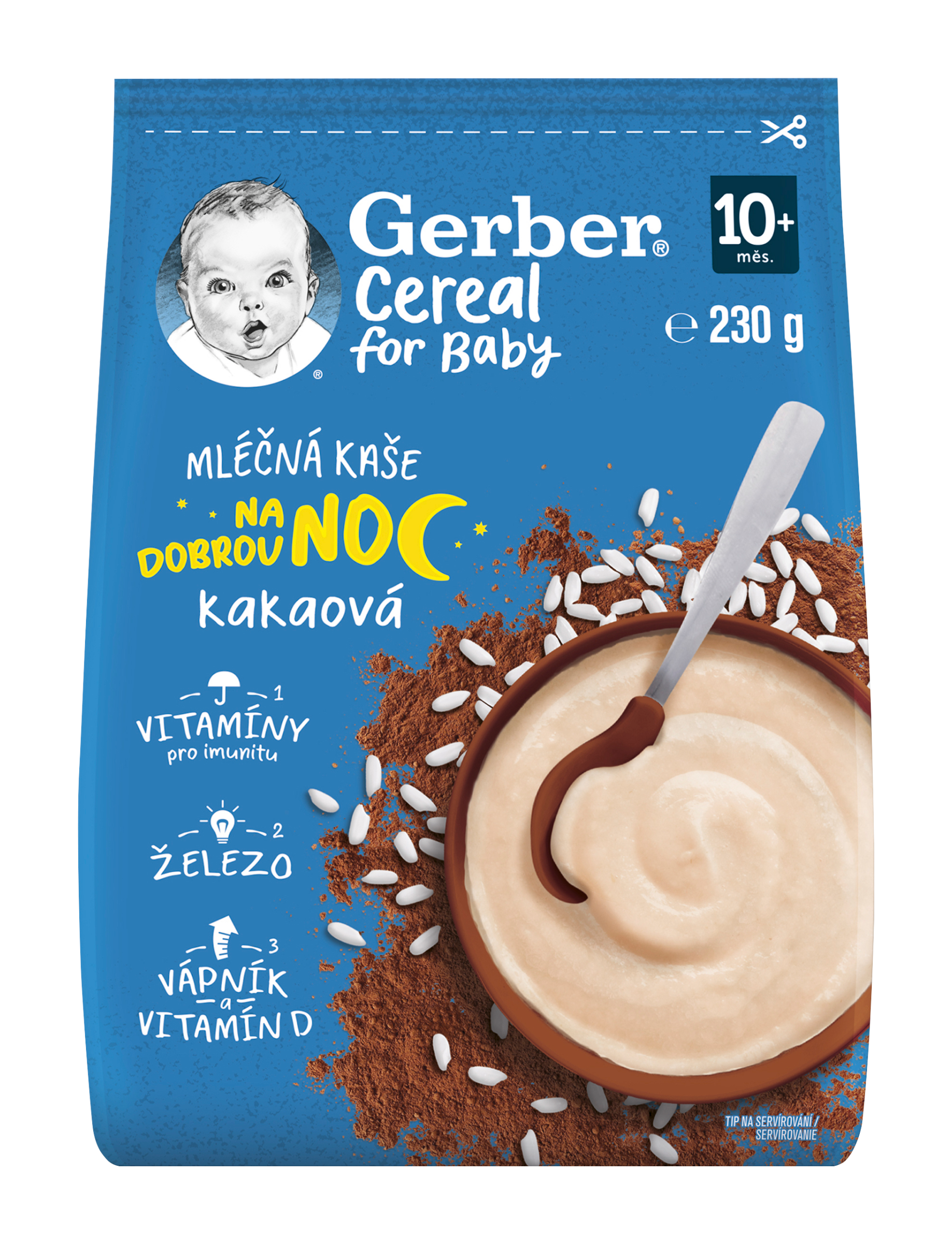GERBER Cereal mléčná kaše kakaová Dobrou noc je kombinací vysoce kvalitní rýžové mouky, jemné chuti kakaa a vitamínů, která uspokojí potřeby děťátka i jeho mlsný jazýček. Kaše je vhodná pro kojence od ukončeného 10. měsíce. Miska plná dobrot obsahuje rýžovou mouku, 11 vitamínů a minerální látky pro správný rozvoj dětského organismu. Každá miska podpoří růst a vývin kostí, normální funkci imunitního systému a rozvoj poznávacích funkcí vašeho děťátka.