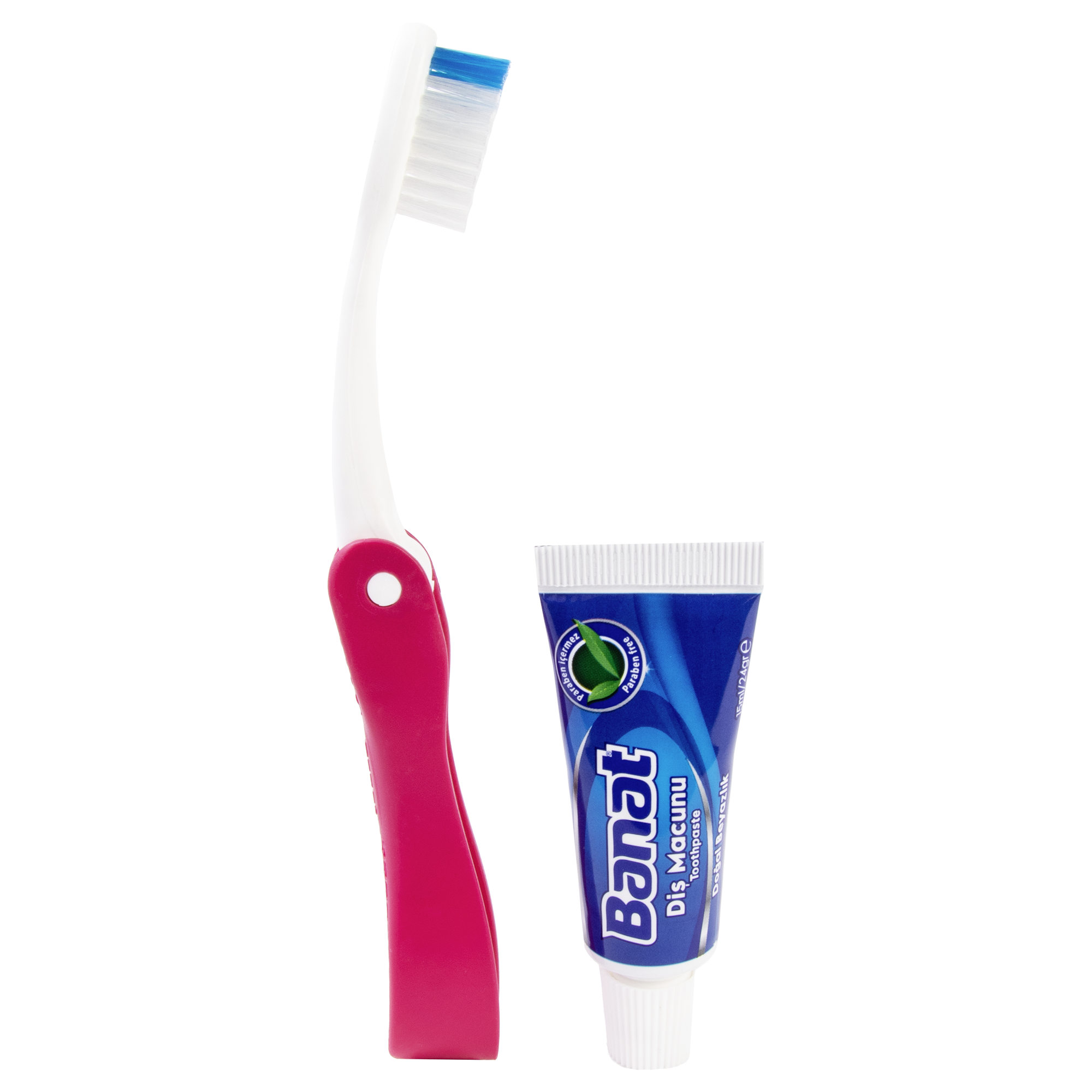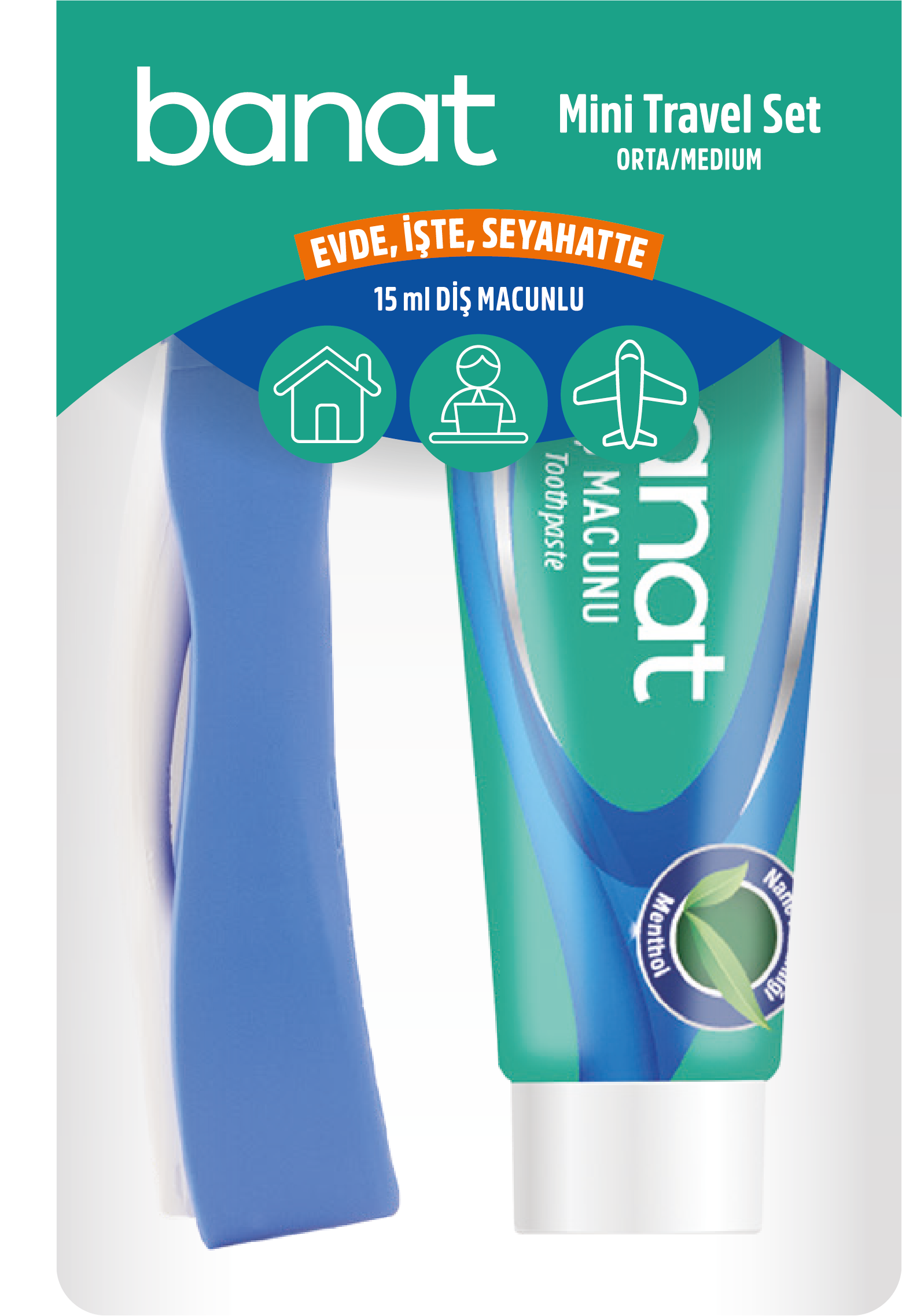 Sada obsahuje skládací cestovní kartáček na zuby Banat a zubní pastu Banat Whitening v tubě 15 ml.