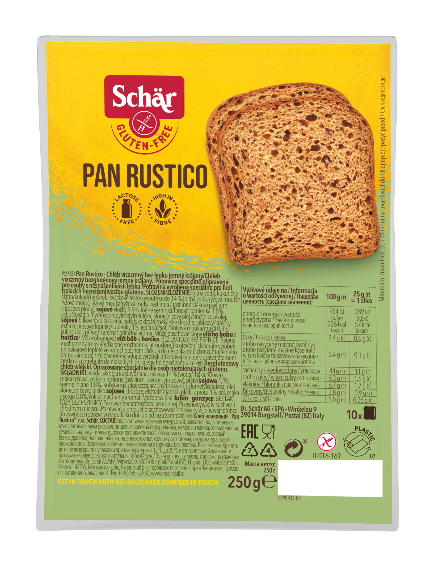 Kukuřičný škrob, Pitná voda, Kváskové těsto 14% (rýžová mouka, pitná voda), Rýžová mouka 6,8%, Rostlinná vláknina (psyllium), Zvlhčující látky: hydroxypropylmethylcelulosa, guma guar, Sójové vločky 2,2%, Lněná semena 2,2%, Slunečnicový olej, Sójová bílkovina, Jablečný extrakt, Lupínky z prosa 1,1%, Čiroková mouka 1%, Cukr, Přírodní aroma, Jedlá sůl, Citrusová vláknina, Pekařské droždí