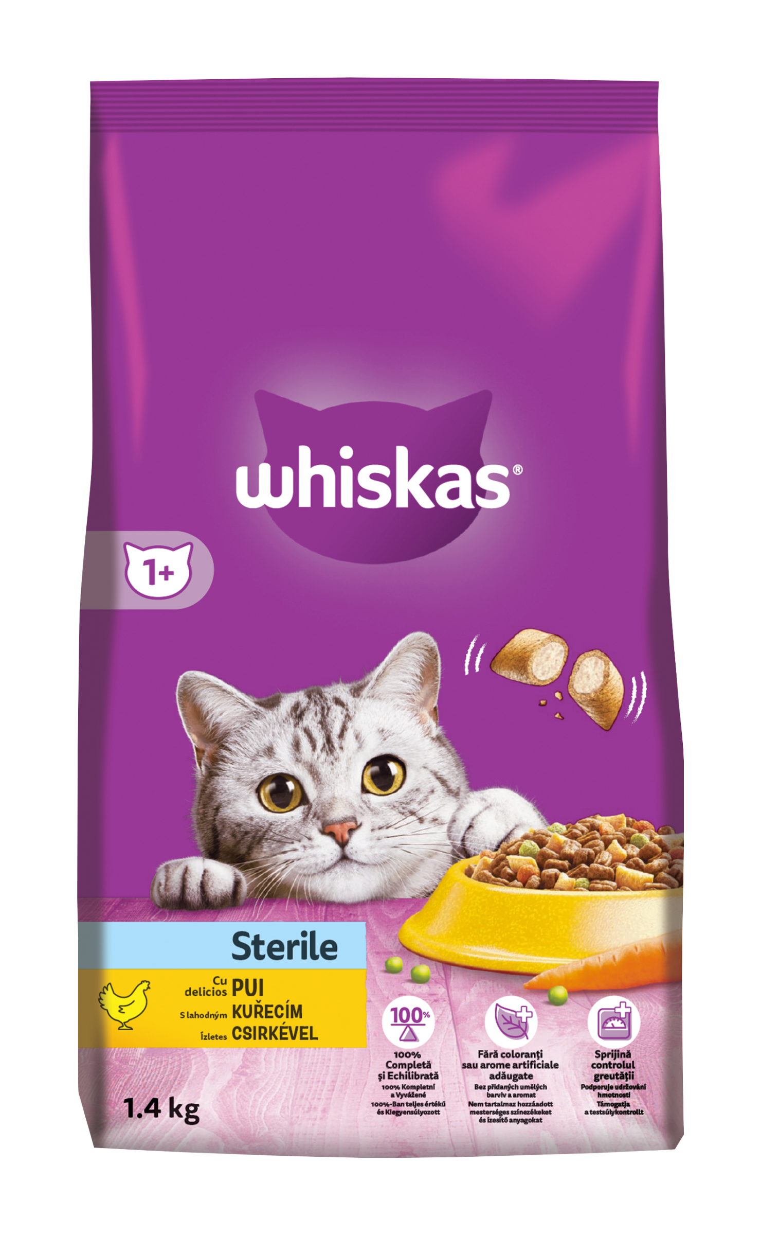 Doporučené dávkování: Kočka o hmotnosti 3 kg potřebuje 35-40 g suchého krmiva denně, kočka o hmotnosti 4 kg potřebuje 45-50 g suchého krmiva denně, kočka o hmotnosti 5 kg potřebuje 55-60 g suchého krmiva denně. 15 g suchého krmiva můžete nahradit 1x 85 g kapsičkou mokrého krmiva Whiskas. Úhrn kalorií se počítá z pochoutek. Množství krmiva slouží pouze jako vodítko. Přizpůsobte dávku krmiva věku, velikosti a úrovni aktivity vaší kočky. Rozdělte jej do porcí pro krmení během dne. Při změně stravy zavádějte nové jídlo postupně. Podrobnější informace naleznete na našich webových stránkách. Nabídněte čerstvou pitnou vodu. Skladujte uzavřené, v chladu a v suchu.