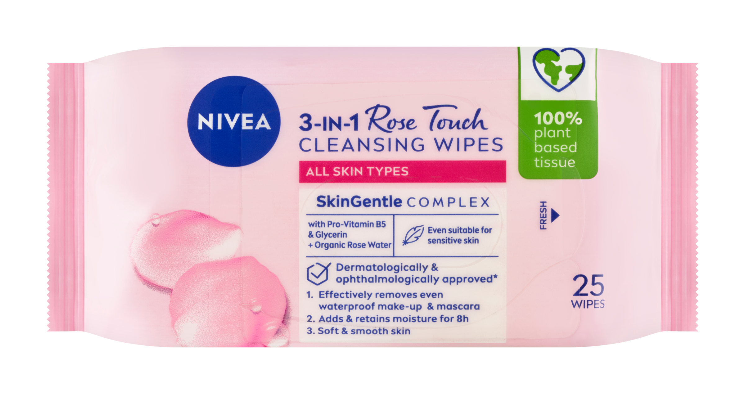 Nivea® Čisticí ubrousky 3 v 1 Rose Touch pro všechny typy pleti důkladně odstraní i voděodolný make-up a nečistoty. Jemné složení s organickou růžovou vodou a komplexem šetrným k pleti (pro-vitamín B5 a glycerin) hydratuje a zklidňuje pleť.