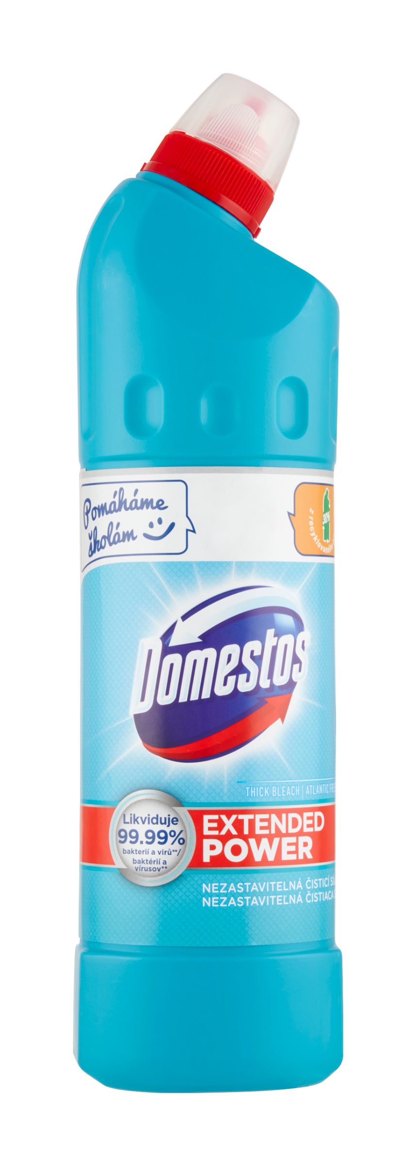 Domestos Extended Power je nová generace dezinfekčního přípravku nyní s obsahem aktivních molekul, jež chrání toaletu před vodním kamenem. Likviduje 99,99 % bakterií a virů. Přilne k povrchu i pod vodní hladinou. Odstraňuje skvrny a brání hromadění vodního kamene v toaletě. Domestos je možné používat v celé domácnosti, a to jak v neředěném stavu, tak ředěný s vodou. Láhev (bez uzávěru) je vyrobena z 30 % recyklovaného plastu.