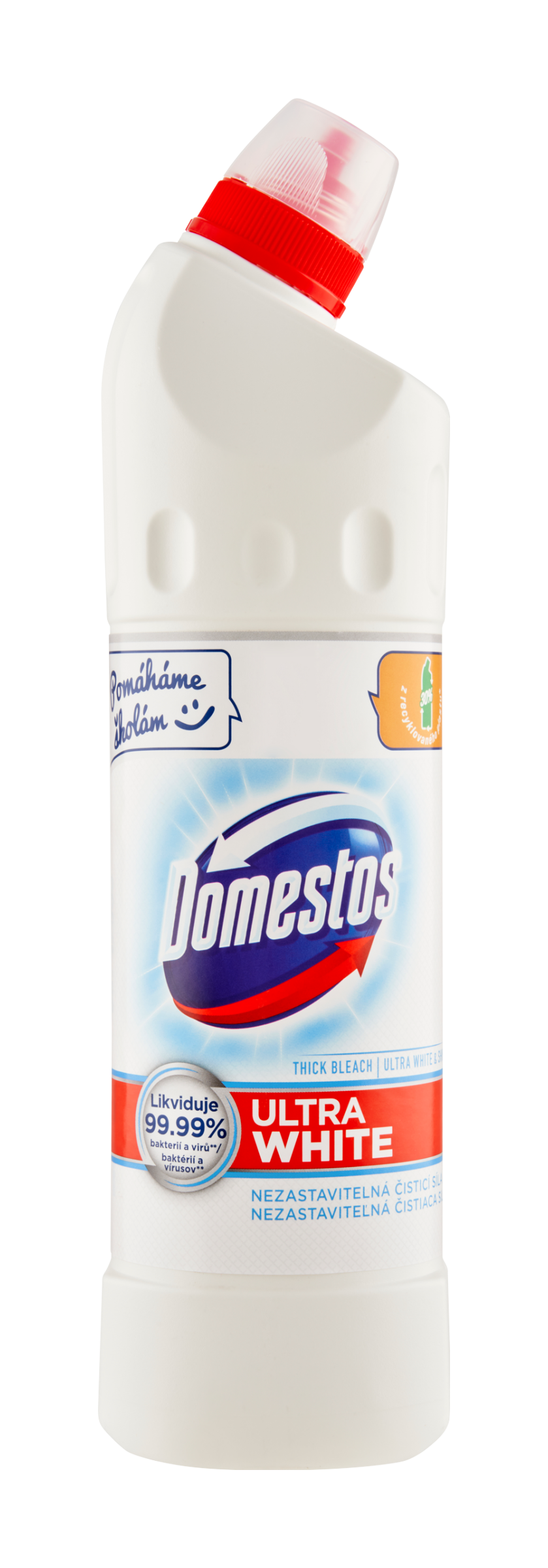Domestos Ultra White White & Shine je nová generace dezinfekčního přípravku nyní s obsahem aktivních molekul, jež chrání toaletu před vodním kamenem. Likviduje 99,99 % bakterií a virů. Přilne k povrchu i pod vodní hladinou. Odstraňuje skvrny a brání hromadění vodního kamene v toaletě. Domestos je možné používat v celé domácnosti, a to jak v neředěném stavu, tak ředěný s vodou. Láhev (bez uzávěru) je vyrobena z 30 % recyklovaného plastu.
