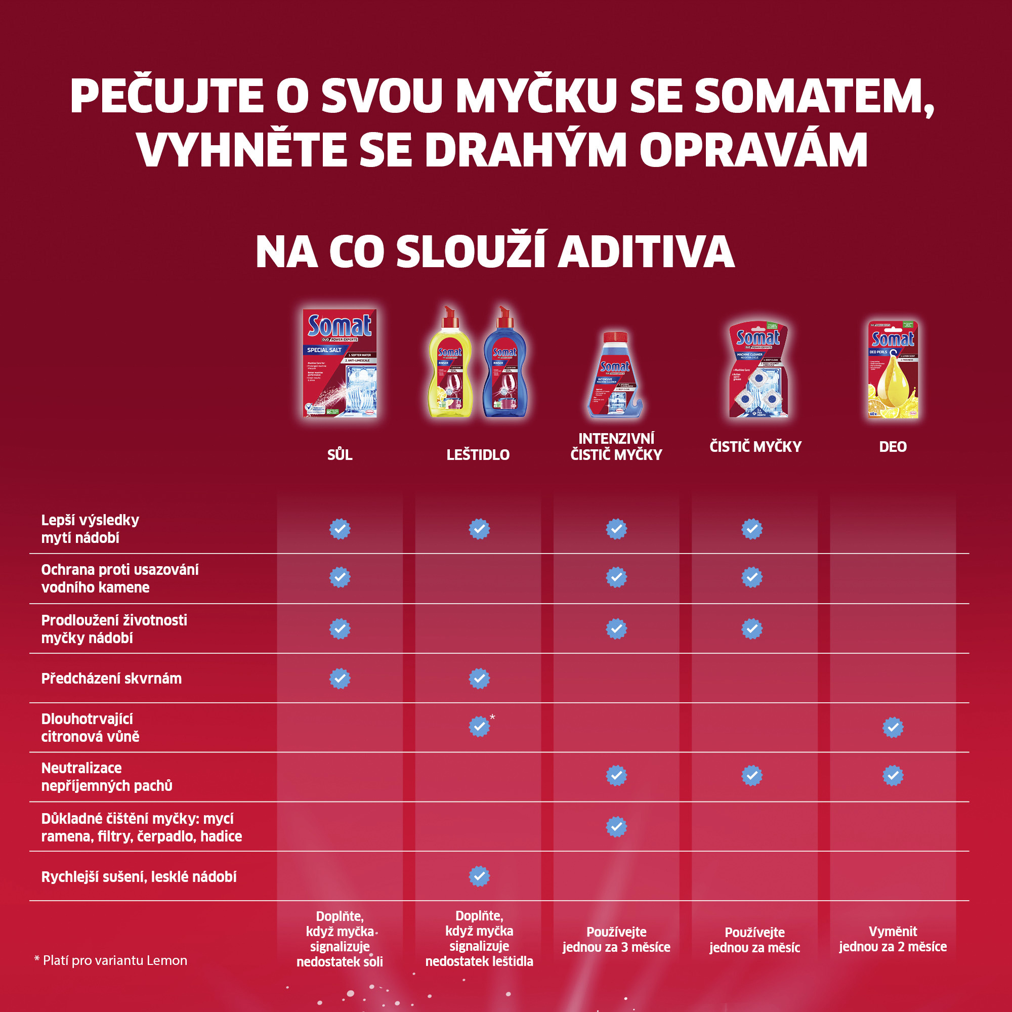 Přejděte na čistič myčky, který můžete používat během běžného mycího cyklu abyste ušetřili vodu a energii. Položte ho na dno plné myčky a zapněte mycí cyklus. Naše výkonné tablety poskytují hloubkovou čistotu, působí proti vodnímu kameni a mastnotám. Pravidelné čistění vaší myčky ulehčuje její údržbu. Používejte Somat čistič myčky jednou měsíčně. Použití: 1. Vložte nádobí do myčky jako obvykle. 2. Nadávkujte mycí prostředek do odpovídající přihrádky. 3. Vybalte tabletu Somat čističe z kartonu a položte ji ve voděrozpustné fólii na dno plné myčky. 4. Spusťte vybraný program mytí. Nepoužívejte, pokud jsou v myčce stříbrné příbory.