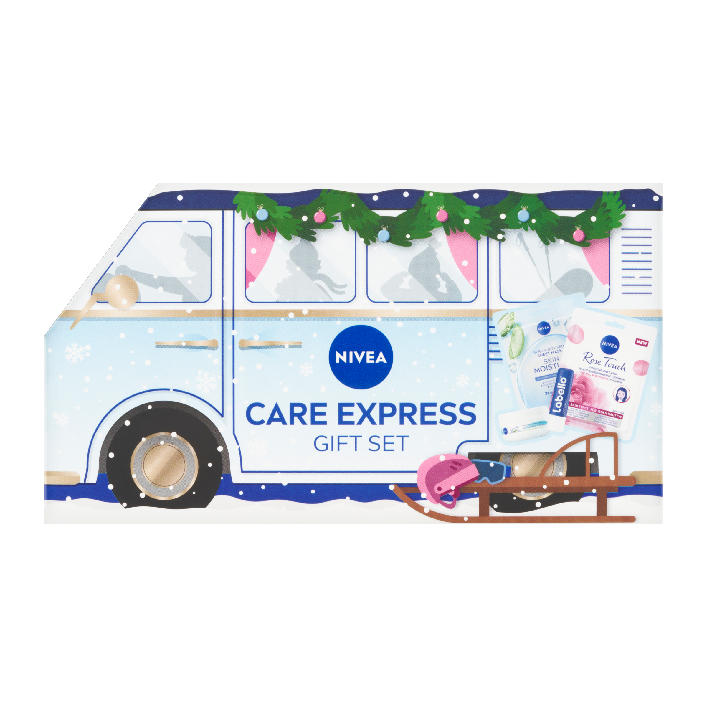 Zaparkujte letos pod stromeček balíček plný péče pro okamžitou hydrataci. Dárkové balení v originálním a hravém designu vánočního minibusu potěší všechny, kdo hledají spolehlivou a okamžitou péči o pleť a pokožku celého těla. O dokonale hebkou a projasněnou pleť se postará dvojice plátýnkových masek. Textilní maska Rose Touch je plná hydratačního séra s kyselinou hyaluronovou, která vyhladí jemné linky a díky růžové vodě také projasní a osvěží plet. Druhá Hydratační textilní maska pleť hydratuje a také zklidní díky obsahu Aloe Vera. Masku stačí nanést na vyčištěnou pleť a užít si 10 minut zasloužené relaxace. Okamžité osvěžení pleti i pokožky celého těla vám dodá svěží hydratační krém Nivea Soft. Jeho lehké složení obsahuje pečující jojobový olej a vitamín E a zanechá pokožku vyživenou a sametově hebkou. Tento univerzální pomocník nesmí chybět v žádné kosmetické taštičce. Pečující rutinu završí balzám na rty Labello Original s vyživujícím bambuckým máslem a makadamiovým olejem pro intenzivní ochranu rtů před vysušováním.