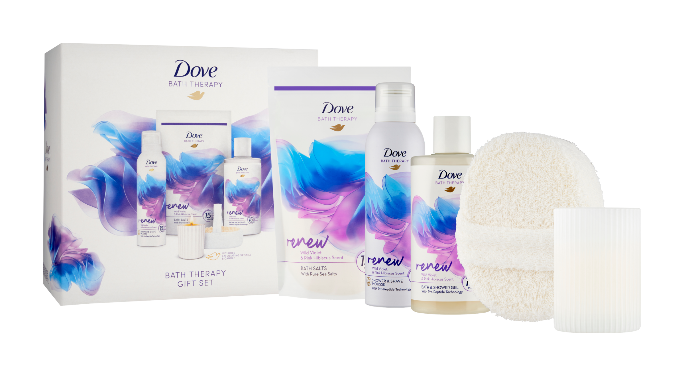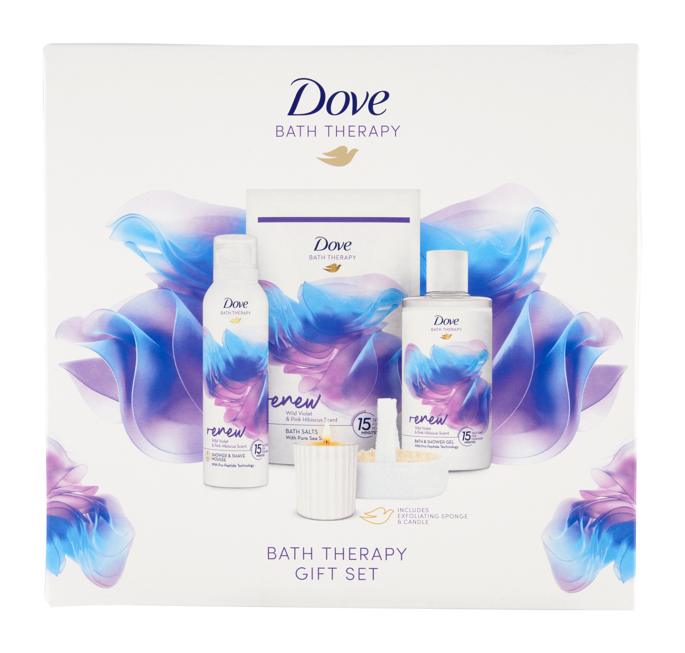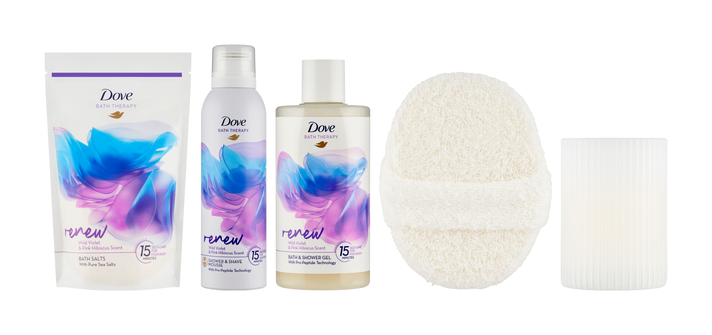 Hledáte ten pravý dárek pro Vaši blízkou osobu? Vsaďte na jistotu. Připravili jsme pro vás dárek plný jemnosti a péče pro pokožku. Přesně to je kosmetická taška Dove Renew, která obsahuje hydratující sprchový gel a pěnu do koupele, sprchovou pěnu, sůl do koupele a jako dárky vonnou svíčku a exfoliační houbu. Sprchový gel a pěna do koupele v jednom vás zrelaxuje po dlouhém dni a zároveň opečuje vaši pokožku pomocí Pro-Peptidové technologie. Použijte sprchovou pěnu Renew pro lehčí a snadné oholení pokožky. V extra náročné dny a za špatného počasí si připravte horkou koupel a provoňte si ji vůní fialky a ibišku pomocí Dove Renew soli do koupele. Pro maximální požitek použijte exfoliační houbu pro ještě jemnější a zářivější pokožku a zapalte si svíčku s klasickou vůní Dove.