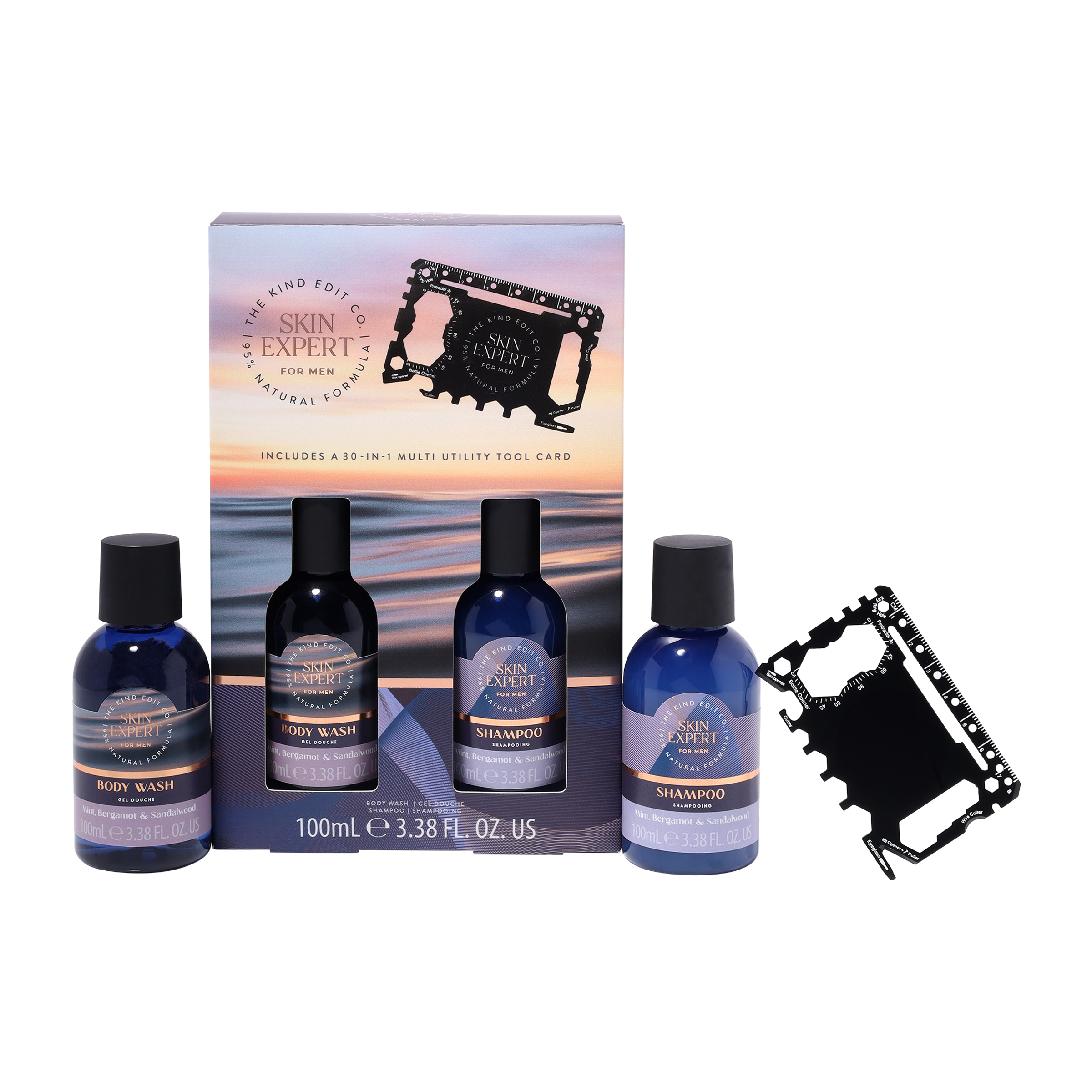 Praktický a stylový dárek v jednom – dárková sada Multi Utility Tool Kit je navržená pro muže, kteří ocení funkčnost, péči i udržitelný přístup. Sada obsahuje kovovou multifunkční kartu s 30 různými využitími, která slouží jako ideální pomocník do peněženky pro každodenní situace i nečekané výzvy. Doplňuje ji 100ml sprchový gel pro osvěžení těla a 100ml šampon pro čisté a upravené vlasy. Tyto pečlivě vybrané produkty odrážejí závazek značky k etickému složení a šetrnosti k životnímu prostředí. Sada Multi Utility Tool Kit je perfektní kombinací praktičnosti a péče, která je vhodná jak na cesty, tak pro každodenní použití.