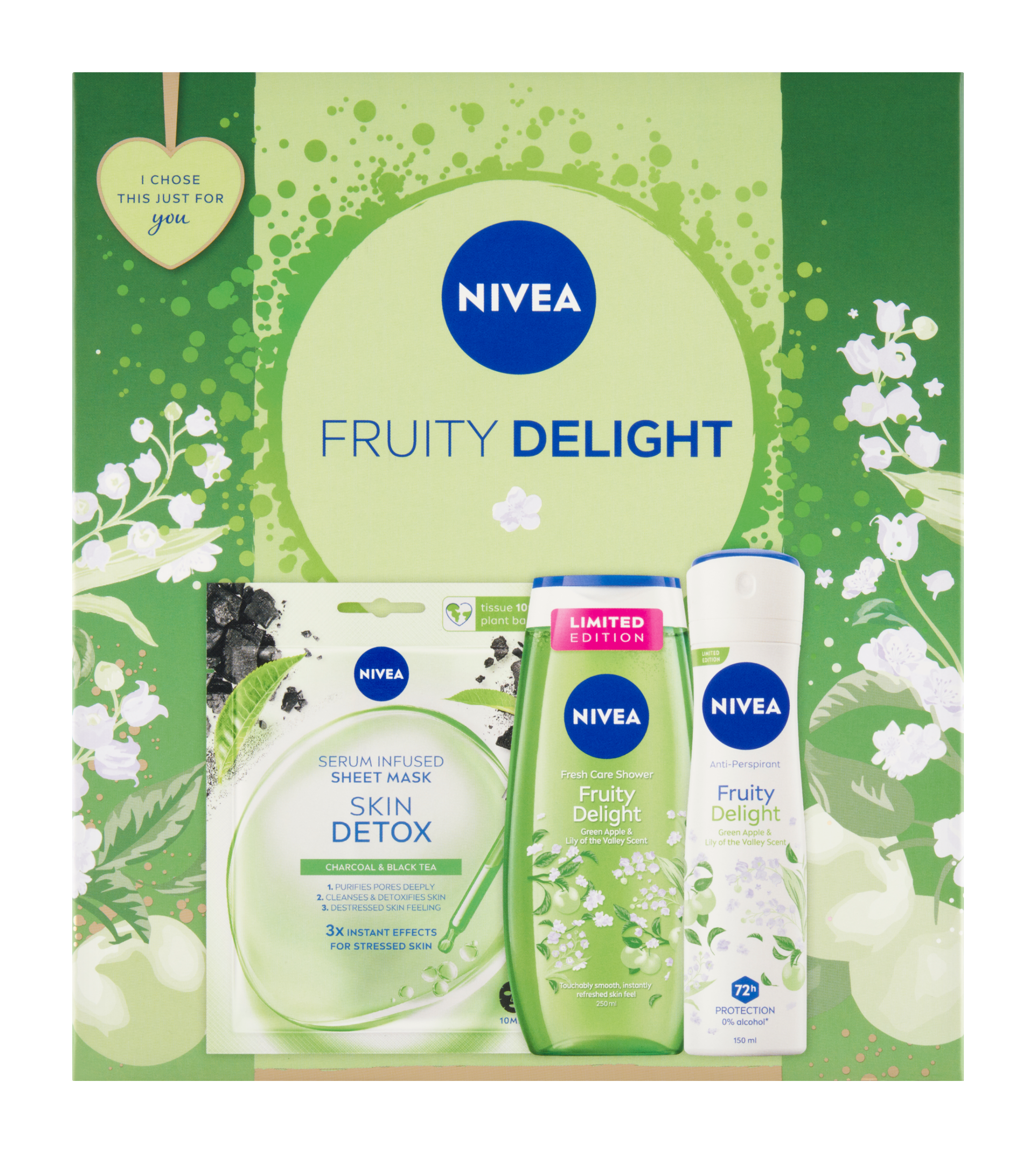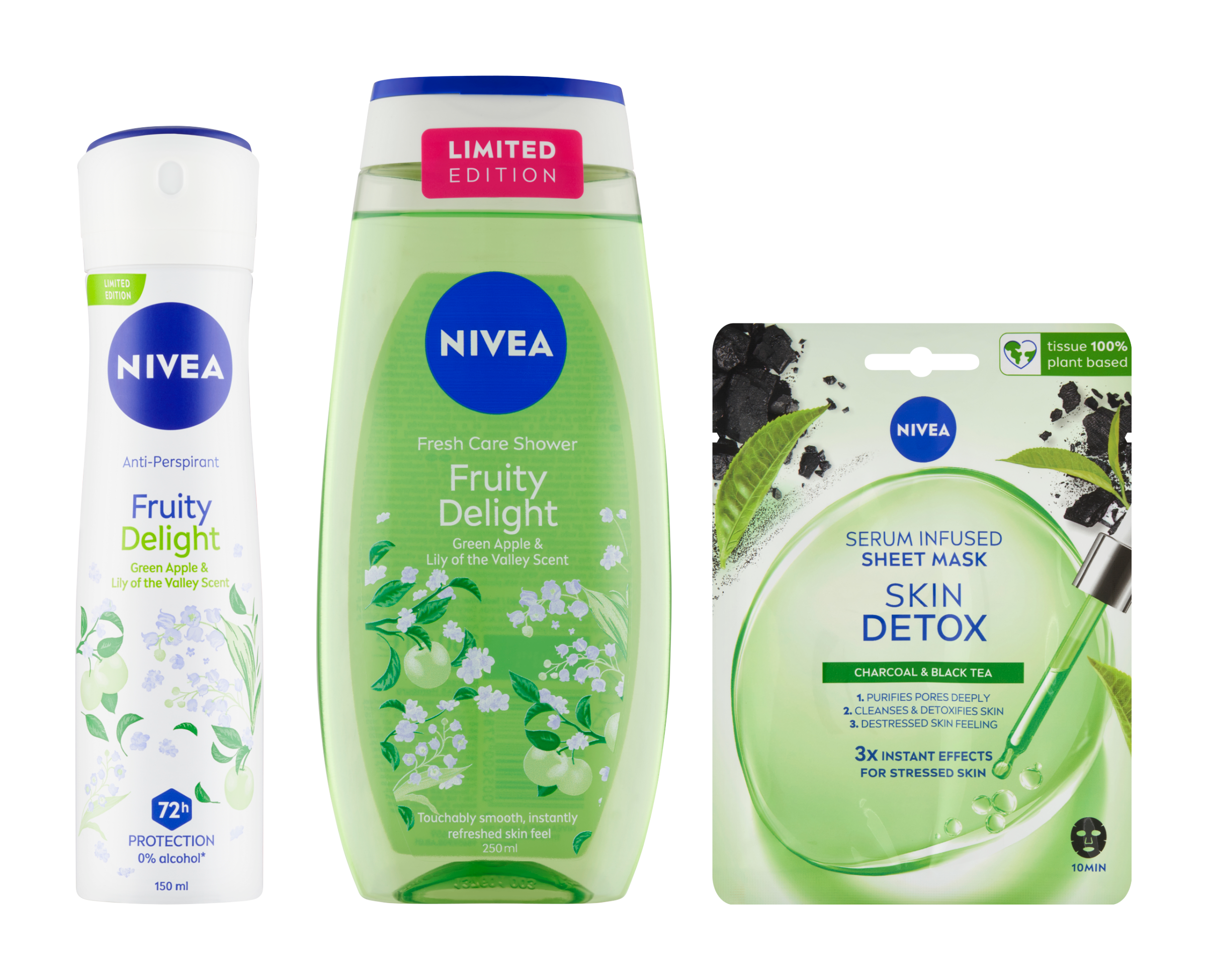 - Nivea® Osvěžující sprchový gel Fruity Delight s ovocnou vůní zeleného jablka a konvalinek. pH šetrné k pokožce. Kožní snášenlivost dermatologicky prokázána. Složení je bez mikroplastů a z 98 % biologicky rozložitelné (dle OECD nebo ekvivalentních metod).