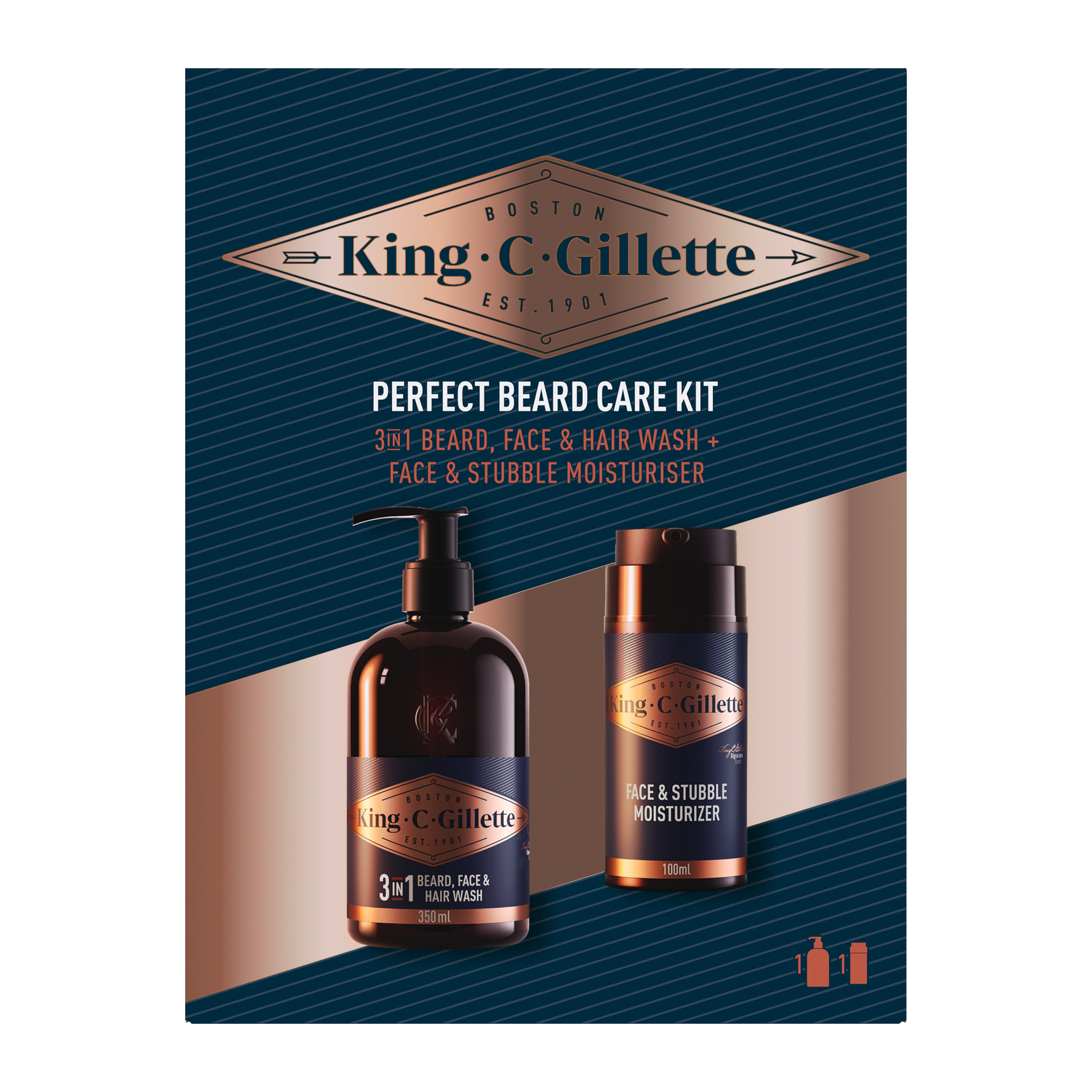Dárková sada Perfect Beard Care Kit je dokonalou volbou pro muže, kteří chtějí posunout péči o pleť a vousy na vyšší úroveň. Čisticí prostředek King C. Gillette pro vousy, obličej a vlasy 3v1 a hydratační krém King C. Gillette společně vytvářejí dokonalý rituál mytí, čištění a hydratace pro zklidnění pokožky a snížení známek suchosti a podráždění.