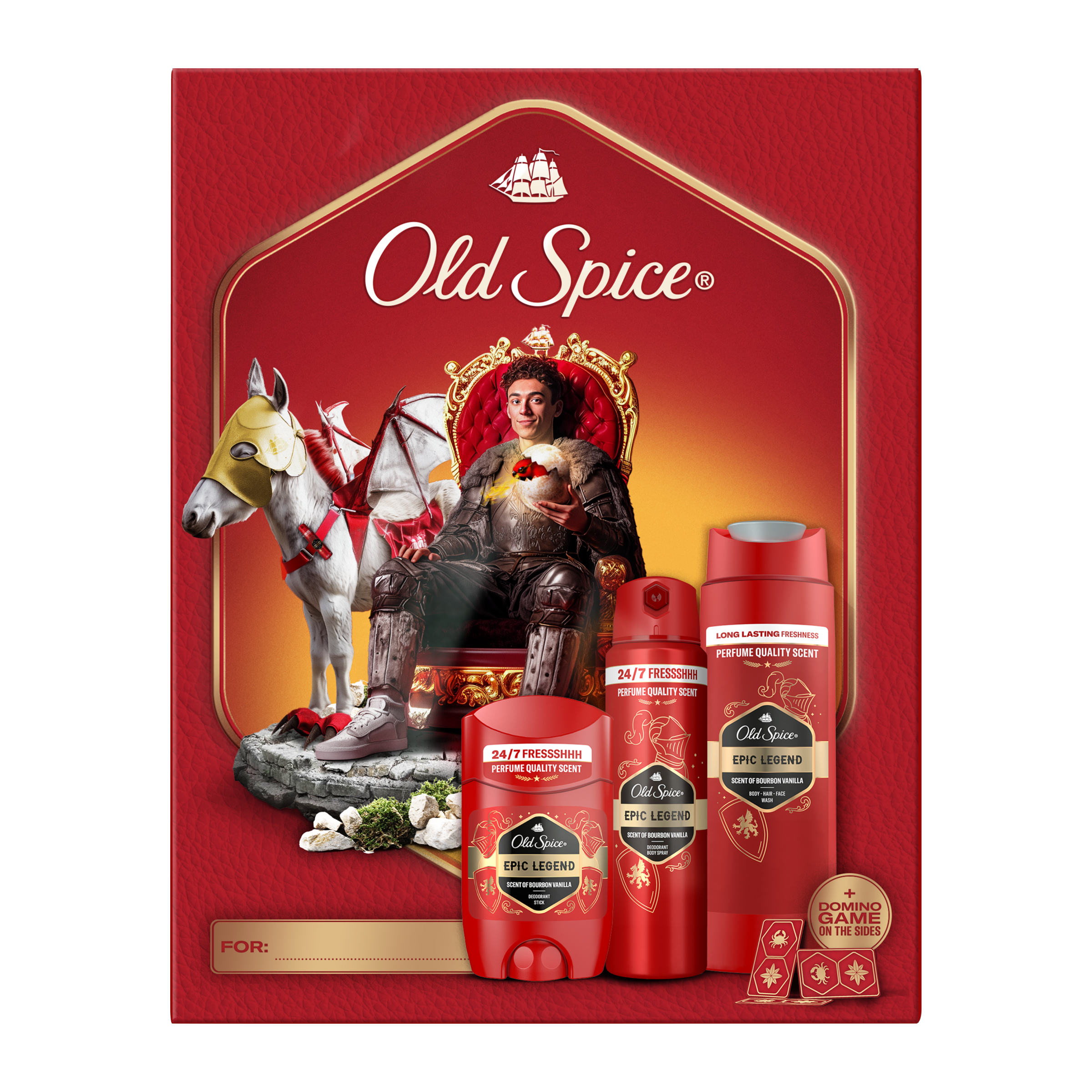 Hledáš dokonalý dárek pro milovníka fantasy, aby se mohl vydávat na epické úkoly s odvahou a legendární vůní? Už ho nemusíš dále hledat! Dárková sada obsahuje tuhý deodorant, sprej a sprchový gel pro muže Epic Legend, vše krásně zabalené v kartonové krabičce s designem Knight. Kromě toho obsahuje hru domino, kterou si sestavíš sám: jednoduše vystříhej kousky z krabičky a užij si voňtastický okamžik! S vůní parfémové kvality Old Spice Epic Legend nemůžeš udělat chybu: vůně bourbonské vanilky, třešňového tabáku, kouřovou vůní dubového dřeva a horkého jantaru tě promění v legendárního rytíře svěžesti. Proč ještě nemáš tuto dárkovou sadu Old Spice ve svém košíku?