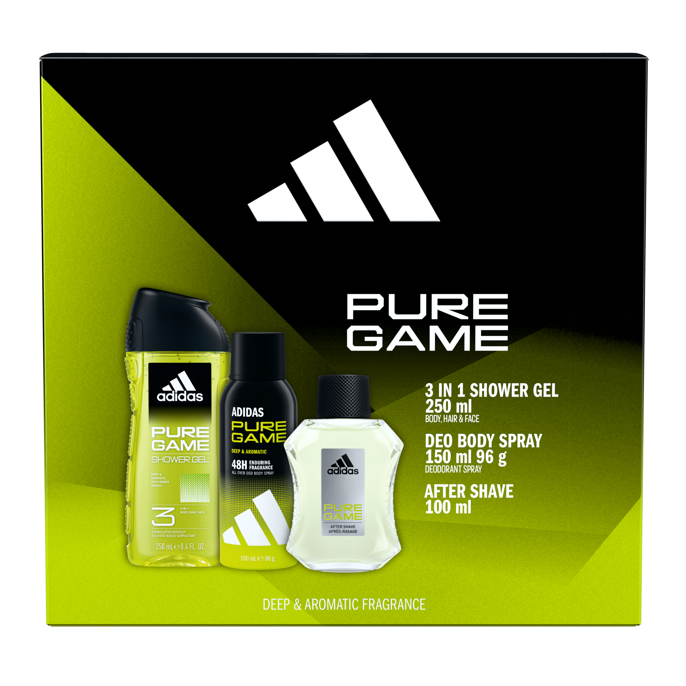 Vánoční kazeta pro muže obsahuje vodu po holení Adidas Pure Game (100 ml), deo body spray (150 ml) a sprchový gel Pure Game (250 ml)
