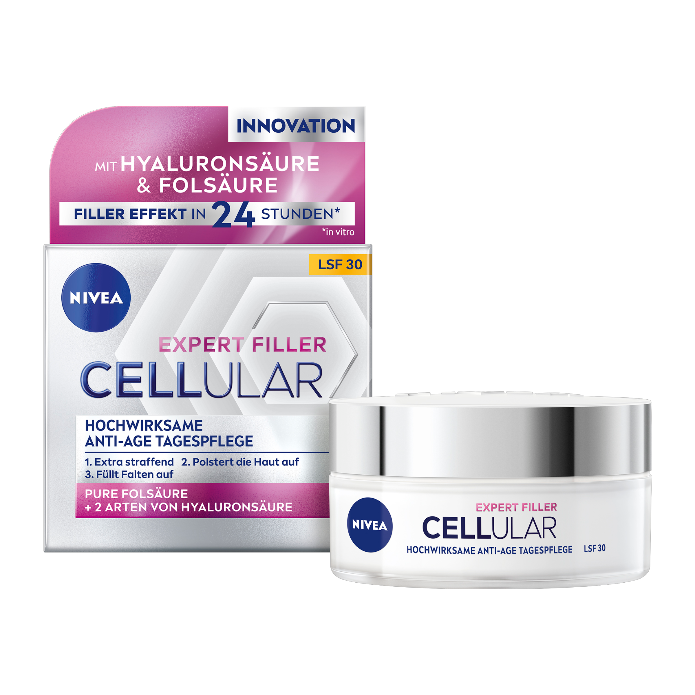 Denní krém Nivea Expert Filler přináší viditelně hladší a pevnější pleť již po prvním dni používání. Krém obsahuje vysoce účinné látky, které působí na buněčnou strukturu pleti. Kyselina listová stimuluje obnovu kožních buněk, opravuje poškození způsobené nejen UV zářením a pomáhá zpomalovat projevy stárnutí. V kombinaci s dvojí kyselinou hyaluronovou získá vaše pleť pevnost a mladistvý vzhled. Makro kyselina hyaluronová intenzivně hydratuje a zvláčňuje, zatímco její mikro obdoba proniká hluboko do struktury pleti, vyplňuje hluboké vrásky a dodává pleti hladší vzhled. Díky UVA a UVB filtrům s ochranným faktorem SPF30 získává pleť ochranu před sluncem a předčasným stárnutím.