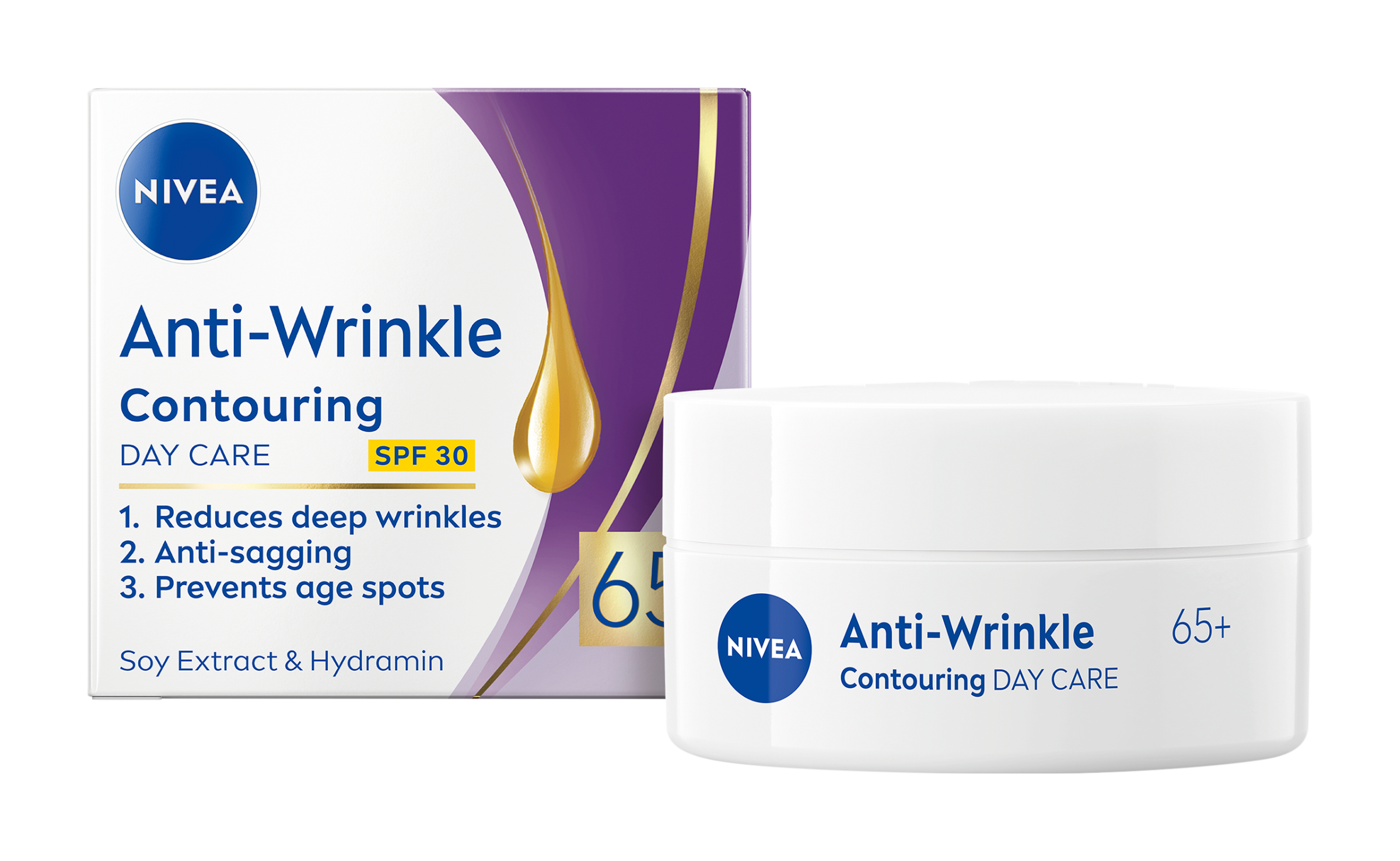 Nivea® Denní krém pro zlepšení kontur 65+ SPF 30 se sójovými výtažky a hydraminem: - Viditelně redukuje hluboké vrásky a předchází vzniku pigmentových skvrn. - Při pravidelném používání zlepšuje kontury zralé pleti. - Pomáhá předcházet vzniku nových vrásek díky UV ochraně (SPF 30).