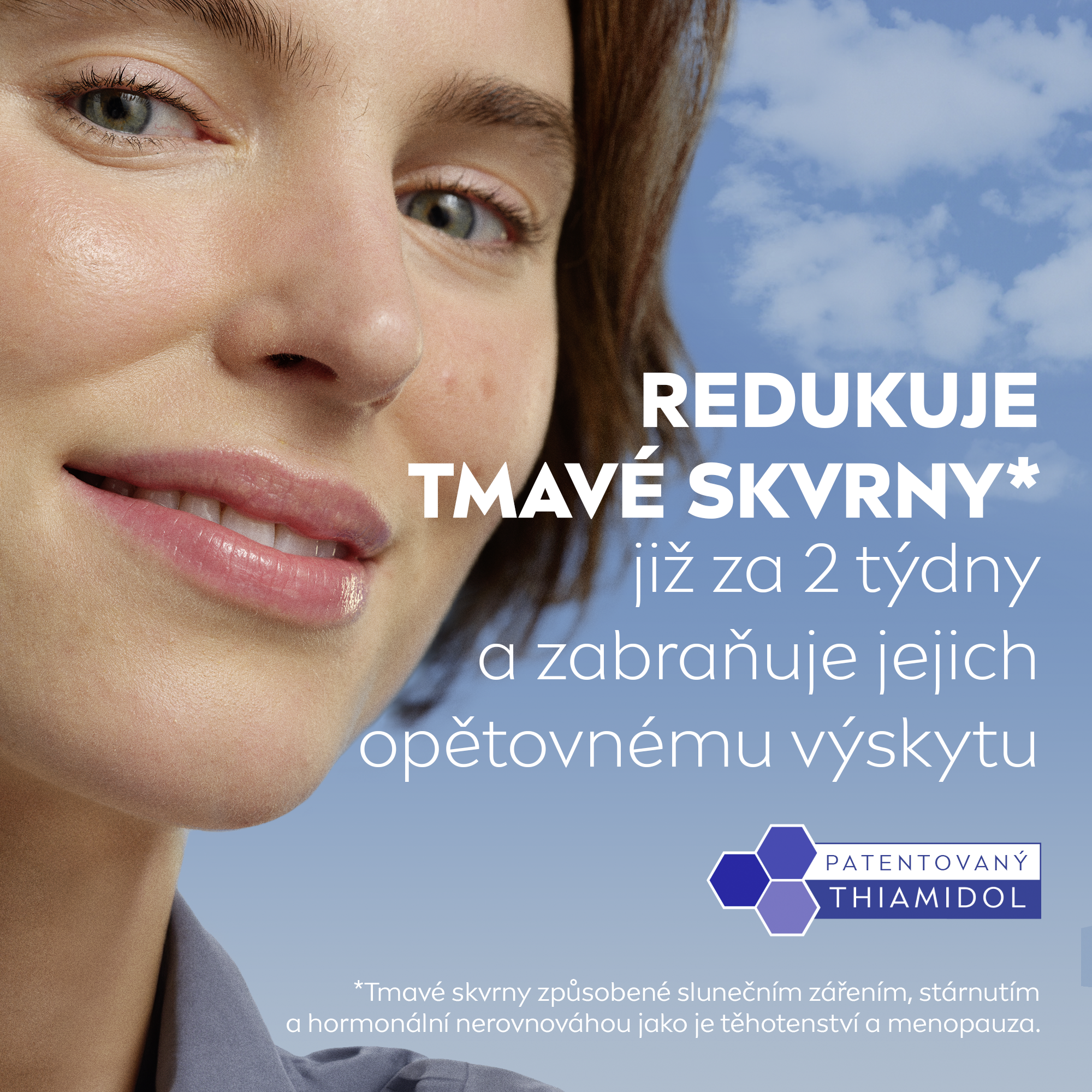 Lehké složení obohacené o patentovanou aktivní látku Thiamidol®, vitamín E, kyselinu hyaluronovou a UVA/UVB filtry redukuje tmavé skvrny¹ již za 2 týdny a zabraňuje jejich opětovnému vzniku. Klinicky prokázáno. Pro sjednocenou a rozjasněnou pleť. Kožní snášenlivost dermatologicky schválena.