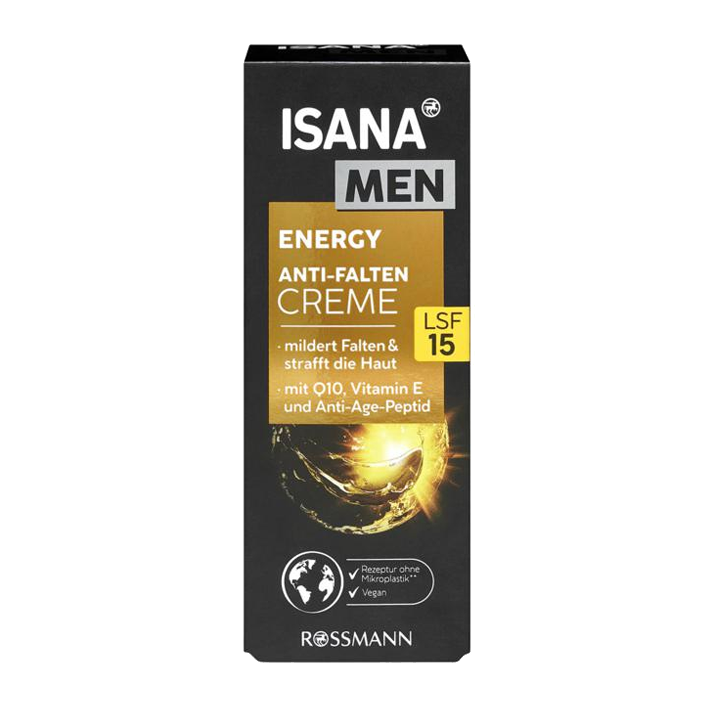 Denní pleťový krém pro muže ISANA Men redukuje hloubku vrásek a zpevňuje pleť, s koenzymem Q10 a vitamínem E, které podporují přirozenou obranyschopnost pleti proti vlivům prostředí vyvolaným UV zářením.