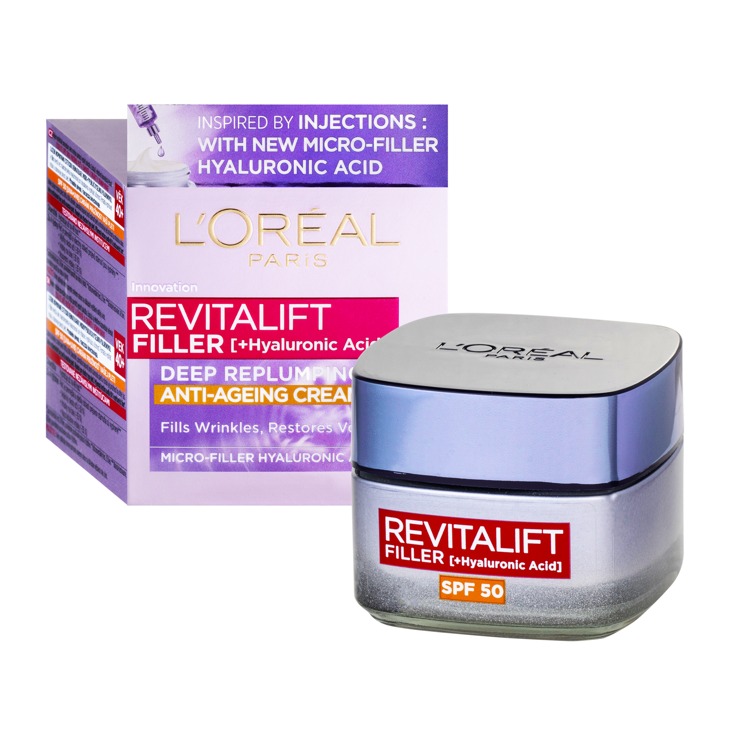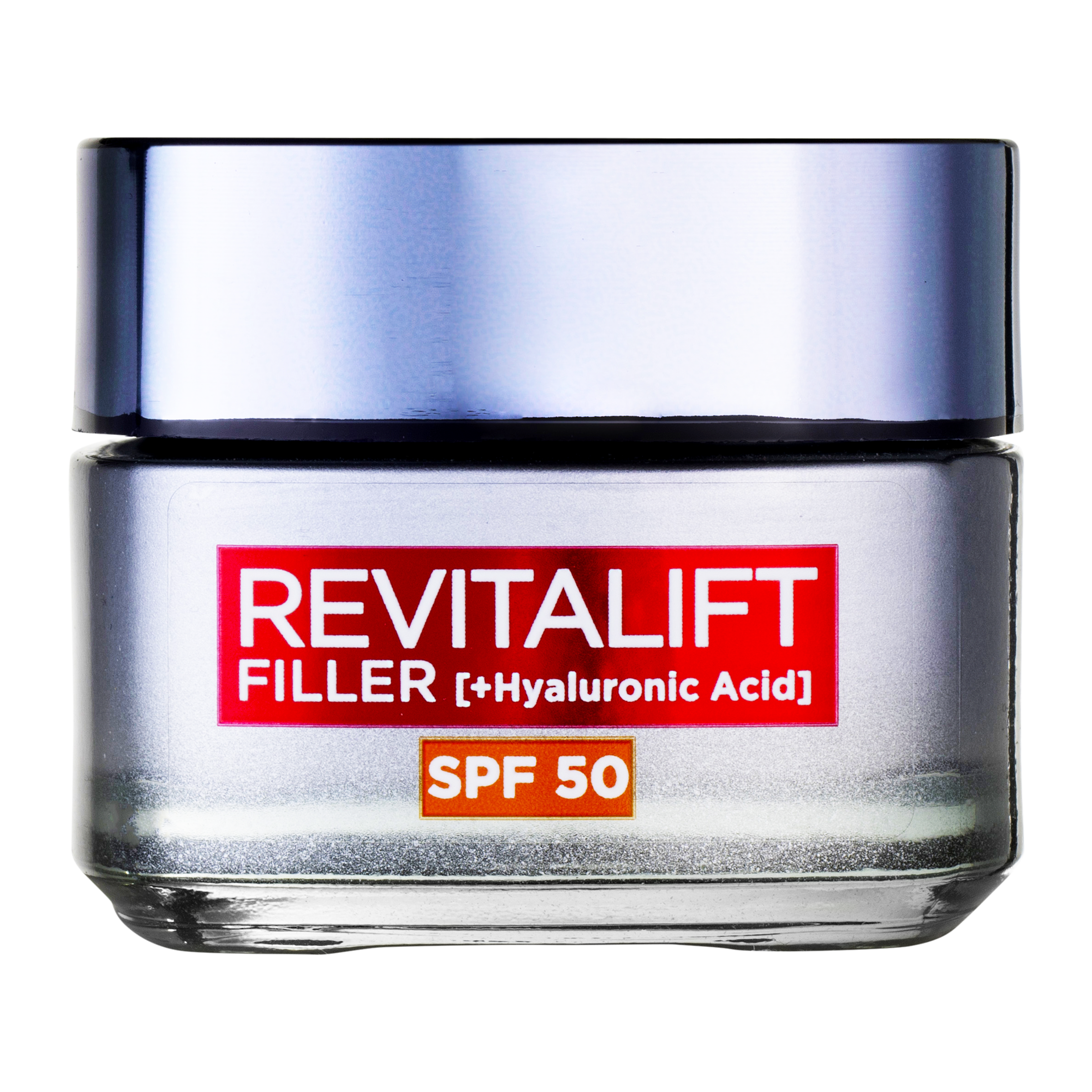 L'oréal Paris Revitalift Filler denní krém SPF 50 okamžitě hydratuje pleť až po dobu 48 hodin. Inovativní složení viditelně navrací pleti pružnost a pevnost, zlepšuje strukturu pleti a výrazně redukuje vrásky. Lehká textura krému chrání pokožku před UVA + UVB zářením za pomoci ochranného faktoru 50. L'ORÉAL PARIS Revitalift Filler denní krém SPF 50 bojuje proti známkám stárnutí a navrací pleti pružnost a pevnost.