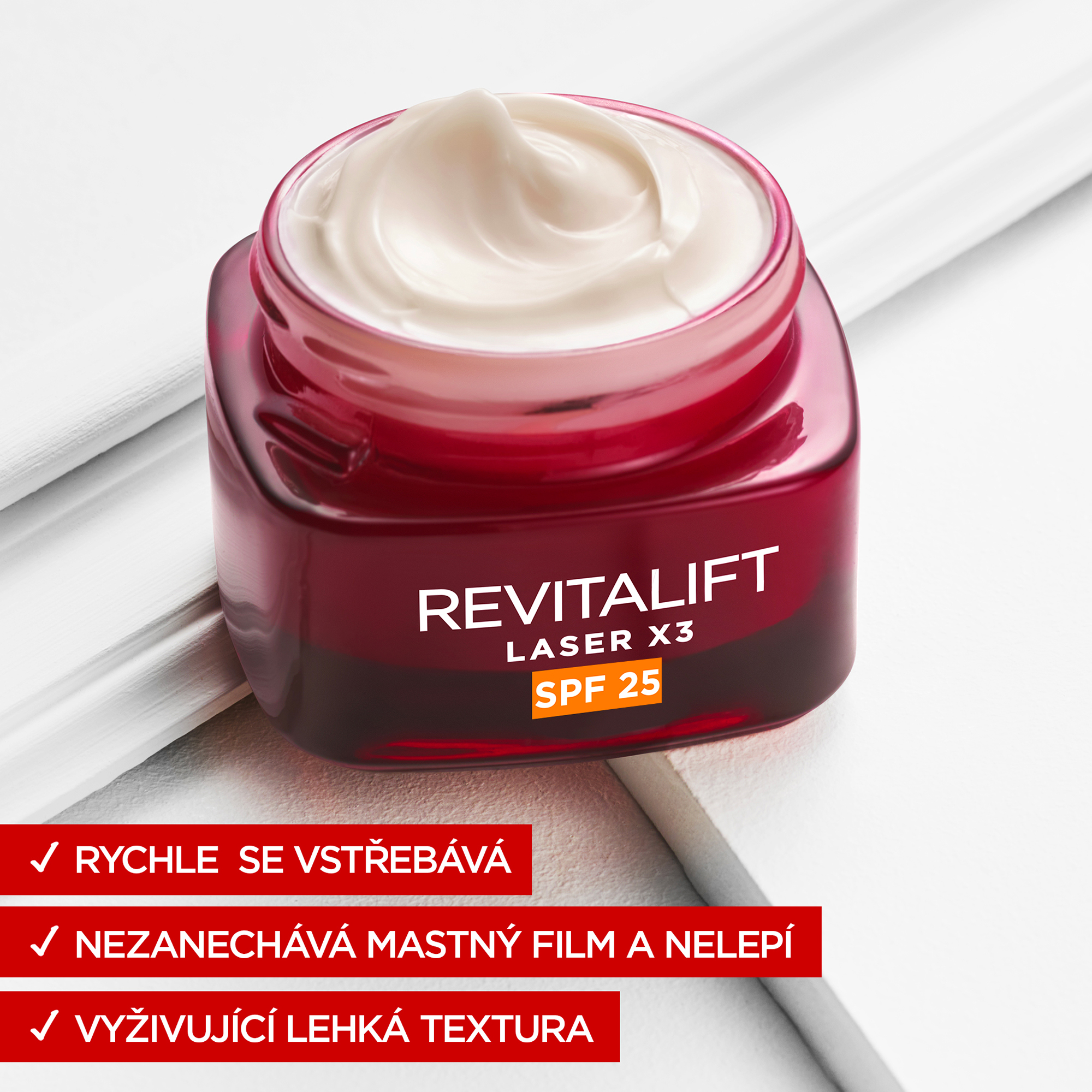 Revitalift Laser X3 denní krém proti vráskám posílen 3 top aktivními látkami doporučovanými dermatology: pro-retinol pomáhá redukovat vrásky a obnovovat texturu pleti, kyselina hyaluronová intenzivně hydratuje a vyplňuje pleť a vitamín C pomáhá rozzářit pleť a viditelně zlepšuje tón pleti. SPF 25 chrání pleť před vznikem pigmentových skvrn.