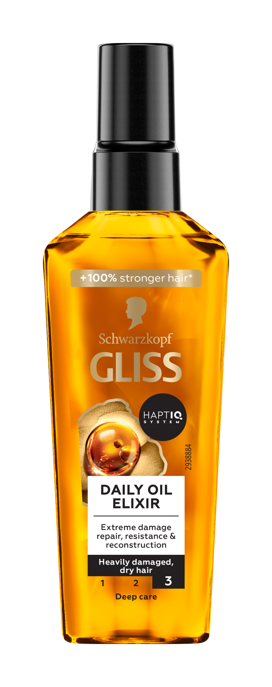 - Gliss Daily Oil elixír pro silně poškozené, suché vlasy. Obnova extrémního poškození, odolnost a regenerace. Naše péče díky systému HAPTIQ vytváří mikrovazby a posiluje vlasovou strukturu.
