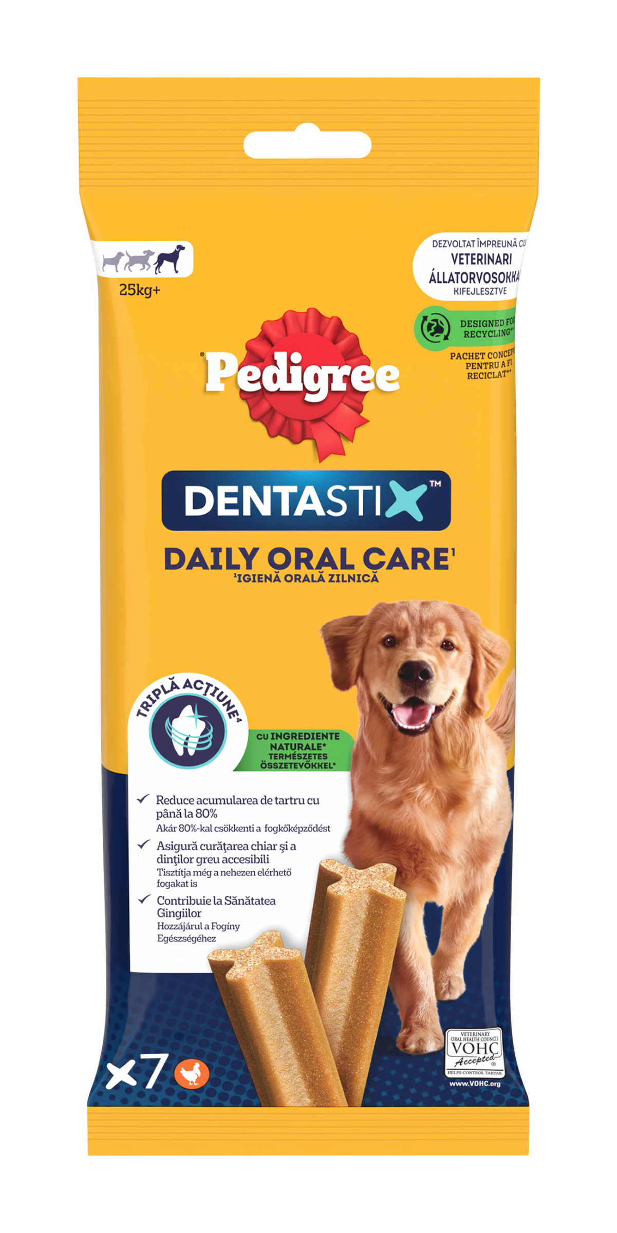 Pedigree Dentastix Daily Oral Care jsou dentální pamlsky v jedinečném tvaru písmene X, u kterých je vědecky dokázáno, že při každodenním užívání pomáhají snižovat tvorbu zubního kamene až o 80 %. Pedigree Dentastix Daily Oral Care mají jemnou abrazivní texturu a aktivní složky, které pomáhají omezit usazování plaku a tvorbu zubního kamene. Jsou chutné, přesto mají nízký obsah tuku, neobsahují přidaný cukr, umělá barviva a ochucovadla. Pedigree – posilujte to dobré ve svém psovi.